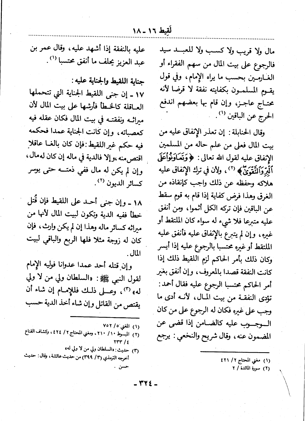 18 - وَإِنْ جَنَى أَحَدٌ عَلَى اللَّقِيطِ فَإِنْ قُتِل خَطَأً فَفِيهِ الدِّيَةُ وَتَكُونُ لِبَيْتِ الْمَال لأَِنَّهَا مِنْ مِيرَاثِهِ كَسَائِرِ مَالِهِ وَهَذَا إِنْ لَمْ يَكُنْ وَارِثٌ، فَإِنْ كَانَ لَهُ زَوْجَةٌ مَثَلاً فَلَهَا الرُّبُعُ وَالْبَاقِي لِبَيْتِ الْمَال.