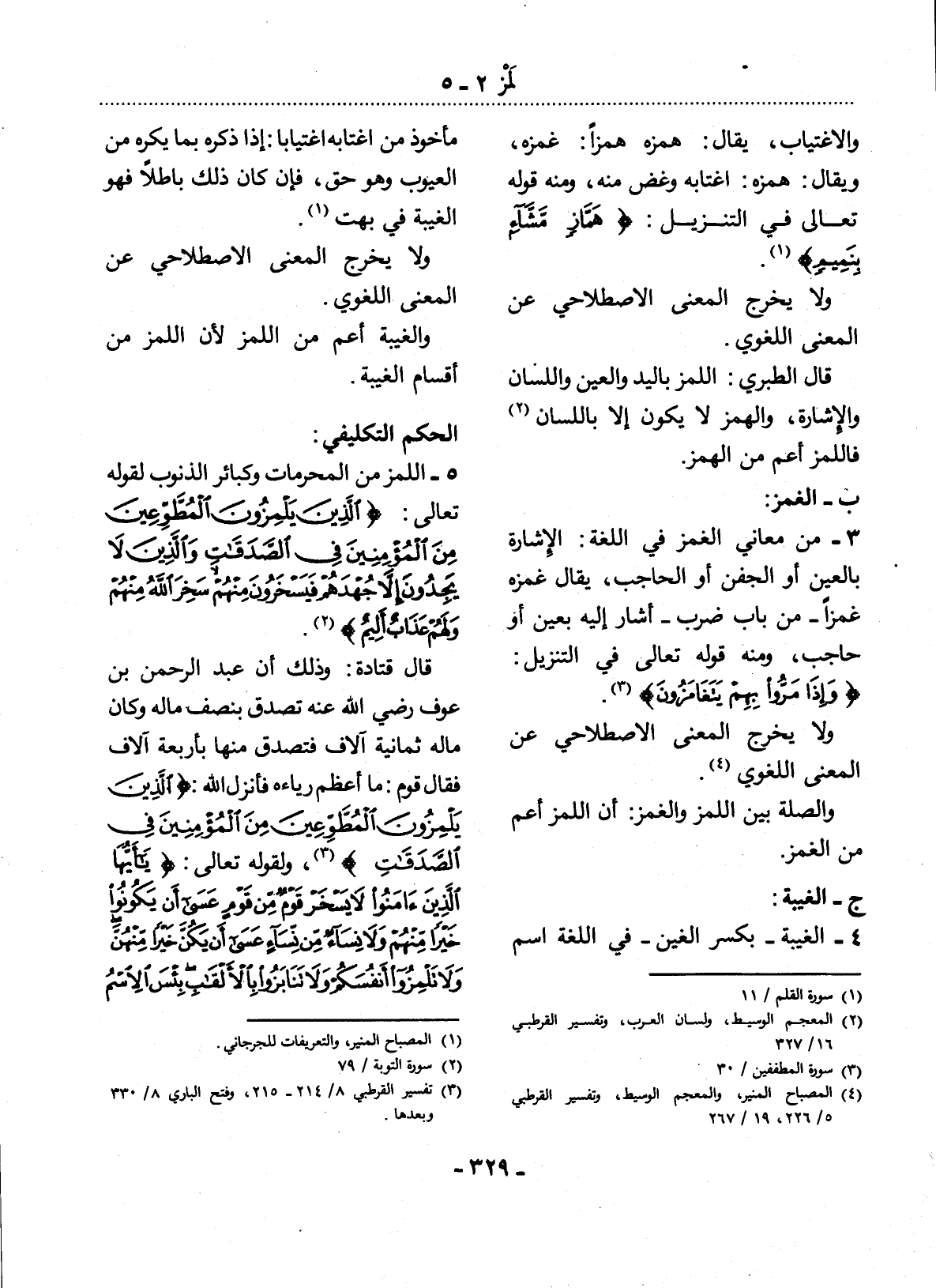 5 - اللَّمْزُ مِنَ الْمُحَرَّمَاتِ وَكَبَائِرِ الذُّنُوبِ لِقَوْلِهِ تَعَالَى: {الَّذِينَ يَلْمِزُونَ الْمُطَّوِّعِينَ مِنَ الْمُؤْمِنِينَ فِي الصَّدَقَاتِ وَالَّذِينَ لاَ يَجِدُونَ إِلاَّ جُهْدَهُمْ فَيَسْخَرُونَ مِنْهُمْ سَخِرَ اللَّهُ مِنْهُمْ وَلَهُمْ عَذَابٌ أَلِيمٌ} (2) قَال قَتَادَةُ: وَذَلِكَ أَنَّ عَبْدَ الرَّحْمَنِ بْنَ عَوْفٍ تَصَدَّقَ بِنِصْفِ مَالِهِ وَكَانَ لَهُ ثَمَانِيَةُ آلاَفٍ فَتَصَدَّقَ مِنْهَا بِأَرْبَعَةِ آلاَفٍ فَقَال قَوْمٌ: مَا أَعْظَمَ رِيَاءَهُ فَأَنْزَل اللَّهُ: {الَّذِينَ يَلْمِزُونَ الْمُطَّوِّعِينَ مِنَ الْمُؤْمِنِينَ فِي الصَّدَقَاتِ} (3) وَلِقَوْلِهِ تَعَالَى: {يَا أَيُّهَا الَّذِينَ آمَنُوا لاَ يَسْخَرْ قَوْمٌ مِنْ قَوْمٍ عَسَى أَنْ يَكُونُوا خَيْرًا مِنْهُمْ وَلاَ نِسَاءٌ مِنْ نِسَاءٍ عَسَى أَنْ يَكُنَّ خَيْرًا مِنْهُنَّ وَلاَ تَلْمِزُوا أَنْفُسَكُمْ وَلاَ تَنَابَزُوا بِالأَْلْقَابِ بِئْسَ الاِسْمُ الْفُسُوقُ بَعْدَ الإِْيمَانِ وَمَنْ لَمْ يَتُبْ فَأُولَئِكَ هُمُ الظَّالِمُونَ} (4) .