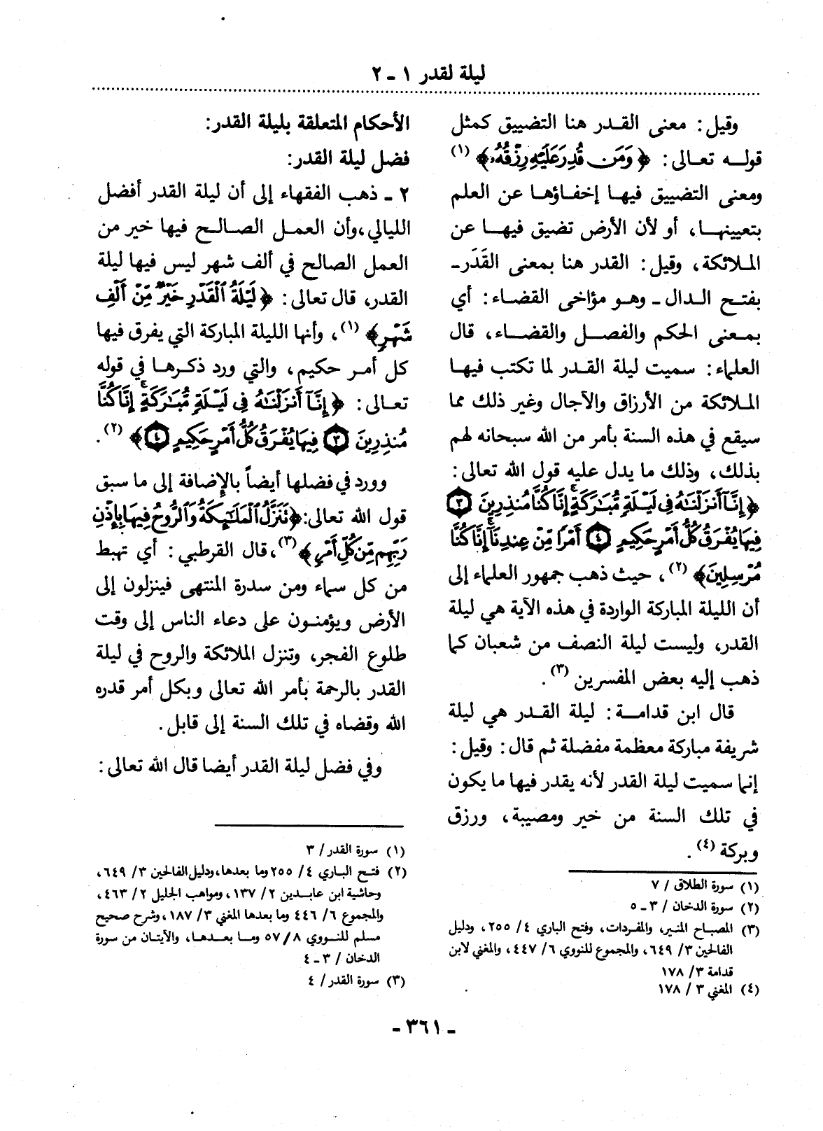 (2) فتح الباري 4 / 255 وما بعدها، ودليل الفالحين 3 / 649، وحاشية ابن عابدين 2 / 137، ومواهب الجليل 2 / 463، والمجموع 6 / 446 وما بعدها المغني 3 / 187، وشرح صحيح مسلم للنووي 8 / 57 وما بعدها، والآيتان من سورة الدخان 3 - 4.