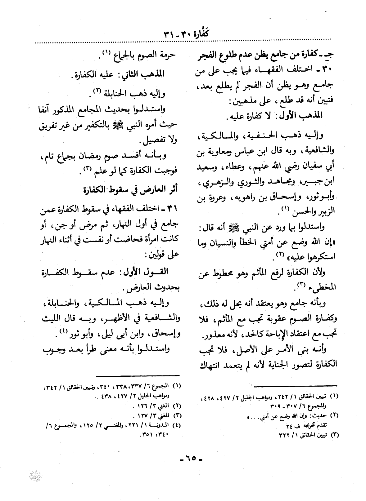 30 - اخْتَلَفَ الْفُقَهَاءُ فِيمَا يَجِبُ عَلَى مَنْ جَامَعَ وَهُوَ يَظُنُّ أَنَّ الْفَجْرَ لَمْ يَطْلُعْ بَعْدُ، فَتَبَيَّنَ أَنَّهُ قَدْ طَلَعَ، عَلَى مَذْهَبَيْنِ: