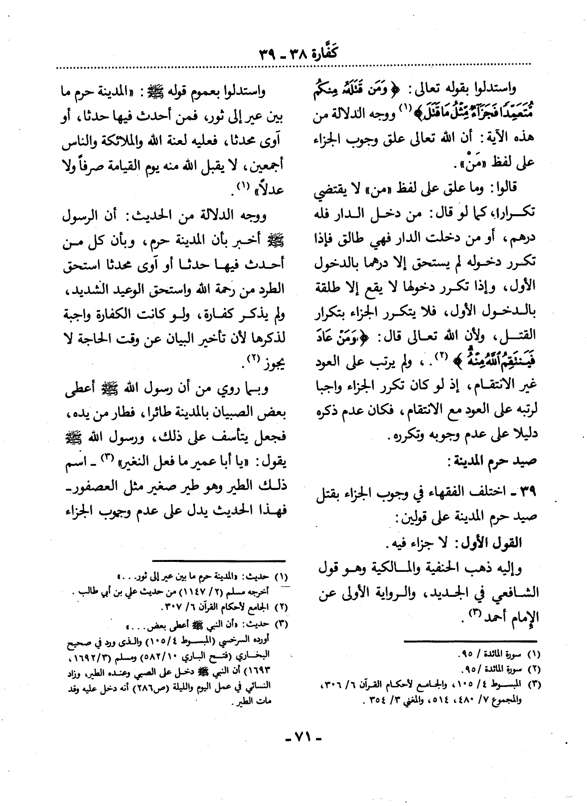 39 - اخْتَلَفَ الْفُقَهَاءُ فِي وُجُوبِ الْجَزَاءِ بِقَتْل صَيْدِ حَرَمِ الْمَدِينَةِ عَلَى قَوْلَيْنِ: