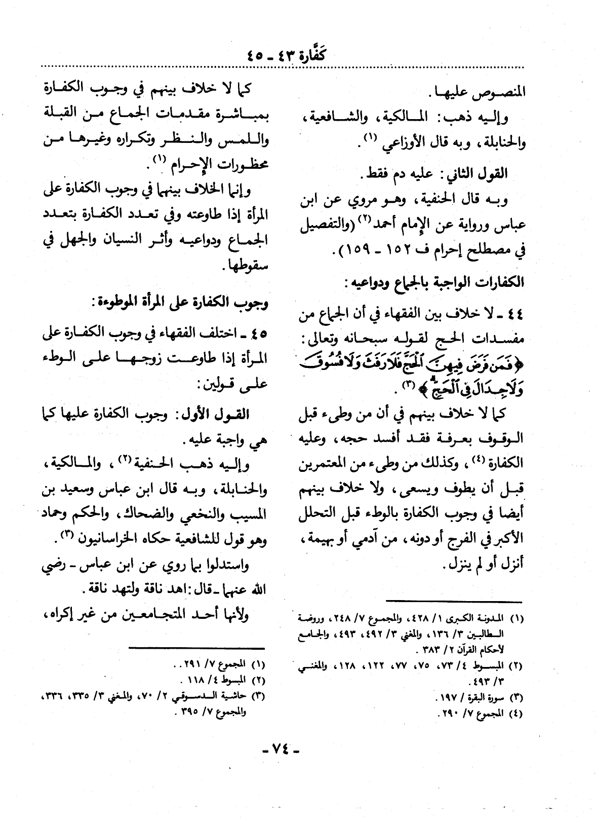45 - اخْتَلَفَ الْفُقَهَاءُ فِي وُجُوبِ الْكَفَّارَةِ عَلَى الْمَرْأَةِ إِذَا طَاوَعَتْ زَوْجَهَا عَلَى الْوَطْءِ عَلَى قَوْلَيْنِ: