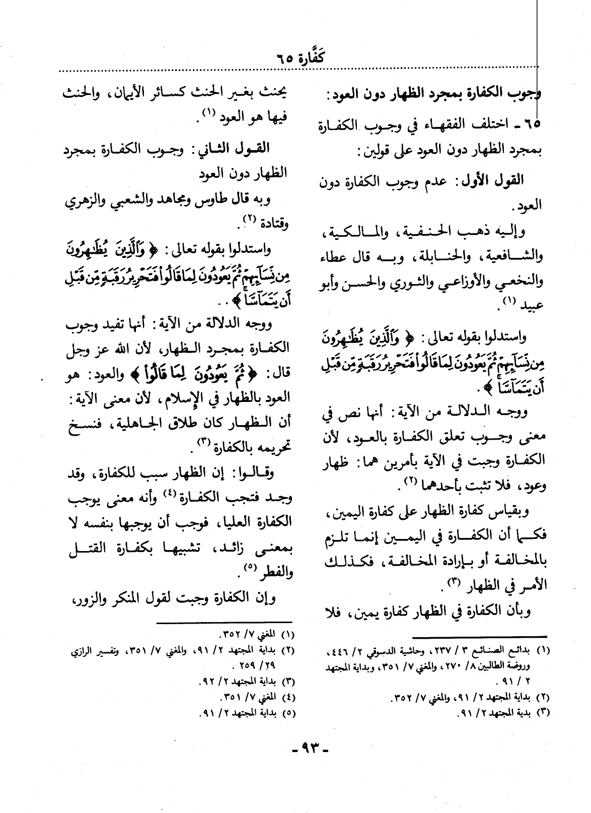 65 - اخْتَلَفَ الْفُقَهَاءُ فِي وُجُوبِ الْكَفَّارَةِ بِمُجَرَّدِ الظِّهَارِ دُونَ الْعَوْدِ عَلَى قَوْلَيْنِ: