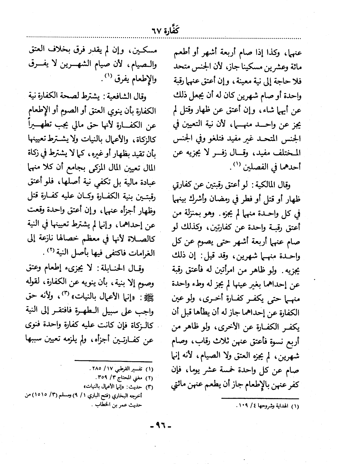 وَقَال الشَّافِعِيَّةُ: يُشْتَرَطُ لِصِحَّةِ الْكَفَّارَةِ نِيَّةُ الْكَفَّارَةِ بِأَنْ يَنْوِيَ الْعِتْقَ أَوِ الصَّوْمَ أَوِ الإِْطْعَامَ عَنِ الْكَفَّارَةِ لأَِنَّهَا حَقٌّ مَالِيٌّ يَجِبُ تَطْهِيرًا كَالزَّكَاةِ، وَالأَْعْمَال بِالنِّيَّاتِ وَلاَ يُشْتَرَطُ تَعْيِينُهَا بِأَنْ تُقَيَّدَ بِظِهَارٍ أَوْ غَيْرِهِ، كَمَا لاَ يُشْتَرَطُ فِي زَكَاةِ الْمَال تَعْيِينُ الْمَال الْمُزَكَّى بِجَامِعِ أَنَّ كُلًّا مِنْهُمَا عِبَادَةٌ مَالِيَّةٌ بَل تَكْفِي نِيَّةُ أَصْلِهَا، فَلَوْ أَعْتَقَ رَقَبَتَيْنِ بِنِيَّةِ الْكَفَّارَةِ وَكَانَ عَلَيْهِ كَفَّارَةُ قَتْلٍ وَظِهَارٍ أَجْزَأَهُ عَنْهُمَا، وَإِنْ أَعْتَقَ وَاحِدَةً وَقَعَتْ عَنْ إِحْدَاهُمَا، وَإِنَّمَا لَمْ يُشْتَرَطْ تَعْيِينُهَا فِي النِّيَّةِ كَالصَّلاَةِ لأَِنَّهَا فِي مُعْظَمِ خِصَالِهَا نَازِعَةٌ إِلَى الْغَرَامَاتِ فَاكْتُفِيَ فِيهَا بِأَصْل النِّيَّةِ (2) .