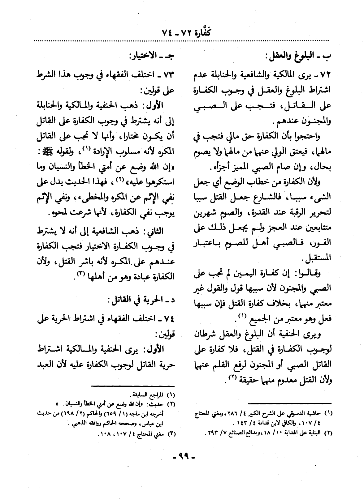 72 - يَرَى الْمَالِكِيَّةُ وَالشَّافِعِيَّةُ وَالْحَنَابِلَةُ عَدَمَ اشْتِرَاطِ الْبُلُوغِ وَالْعَقْل فِي وُجُوبِ الْكَفَّارَةِ عَلَى الْقَاتِل، فَتَجِبُ عَلَى الصَّبِيِّ وَالْمَجْنُونِ عِنْدَهُمْ.