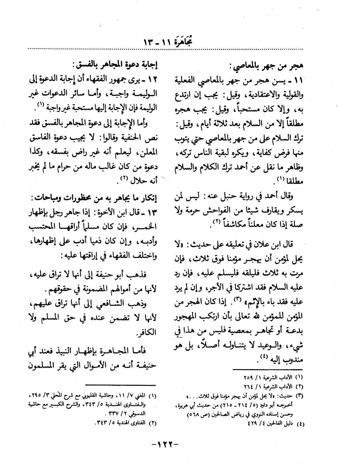 11 - يُسَنُّ هَجْرُ مَنْ جَهَرَ بِالْمَعَاصِي الْفِعْلِيَّةِ وَالْقَوْلِيَّةِ وَالاِعْتِقَادِيَّةِ، وَقِيل: يَجِبُ إِنِ ارْتَدَعَ بِهِ، وَإِلاَّ كَانَ مُسْتَحَبًّا، وَقِيل: يَجِبُ هَجْرُهُ مُطْلَقًا إِلاَّ مِنَ السَّلاَمِ بَعْدَ ثَلاَثَةِ أَيَّامٍ، وَقِيل: تَرْكُ السَّلاَمِ عَلَى مَنْ جَهَرَ بِالْمَعَاصِي حَتَّى يَتُوبَ مِنْهَا فَرْضُ كِفَايَةٍ، وَيُكْرَهُ لِبَقِيَّةِ النَّاسِ تَرْكُهُ، وَظَاهِرُ مَا نُقِل عَنْ أَحْمَدَ تَرْكُ الْكَلاَمِ وَالسَّلاَمِ مُطْلَقًا (1) .