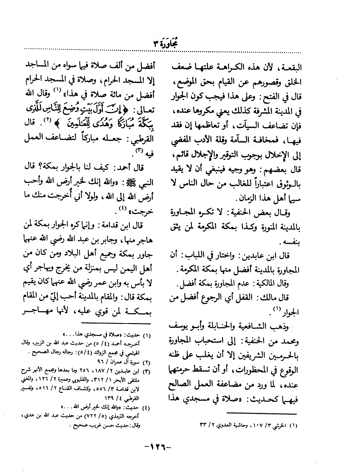 وَذَهَبَ الشَّافِعِيَّةُ وَالْحَنَابِلَةُ وَأَبُو يُوسُفَ وَمُحَمَّدٌ مِنَ الْحَنَفِيَّةِ: إِلَى اسْتِحْبَابِ الْمُجَاوَرَةِ بِالْحَرَمَيْنِ الشَّرِيفَيْنِ إِلاَّ أَنْ يَغْلِبَ عَلَى ظَنِّهِ الْوُقُوعُ فِي الْمَحْظُورَاتِ، أَوْ أَنْ تَسْقُطَ حُرْمَتُهُمَا عِنْدَهُ، لِمَا وَرَدَ مِنْ مُضَاعَفَةِ الْعَمَل الصَّالِحِ فِيهِمَا كَحَدِيثِ: صَلاَةٌ فِي مَسْجِدِي هَذَا