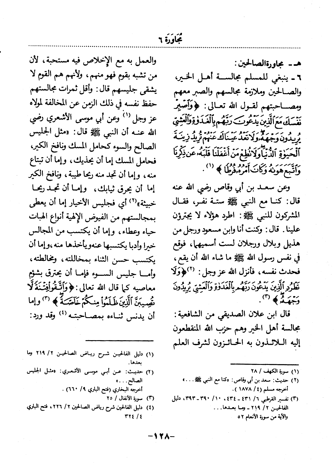 6 - يَنْبَغِي لِلْمُسْلِمِ مُجَالَسَةُ أَهْل الْخَيْرِ، وَالصَّالِحِينَ وَمُلاَزَمَةُ مَجَالِسِهِمْ، وَالصَّبْرُ مَعَهُمْ، وَمُصَاحَبَتُهُمْ لِقَوْل اللَّهِ تَعَالَى: {وَاصْبِرْ نَفْسَكَ مَعَ الَّذِينَ يَدْعُونَ رَبَّهُمْ بِالْغَدَاةِ وَالْعَشِيِّ يُرِيدُونَ وَجْهَهُ وَلاَ تَعْدُ عَيْنَاكَ عَنْهُمْ تُرِيدُ زِينَةَ الْحَيَاةِ الدُّنْيَا وَلاَ تُطِعْ مَنْ أَغْفَلْنَا قَلْبَهُ عَنْ ذِكْرِنَا وَاتَّبَعَ هَوَاهُ وَكَانَ أَمْرُهُ فُرُطًا} .
