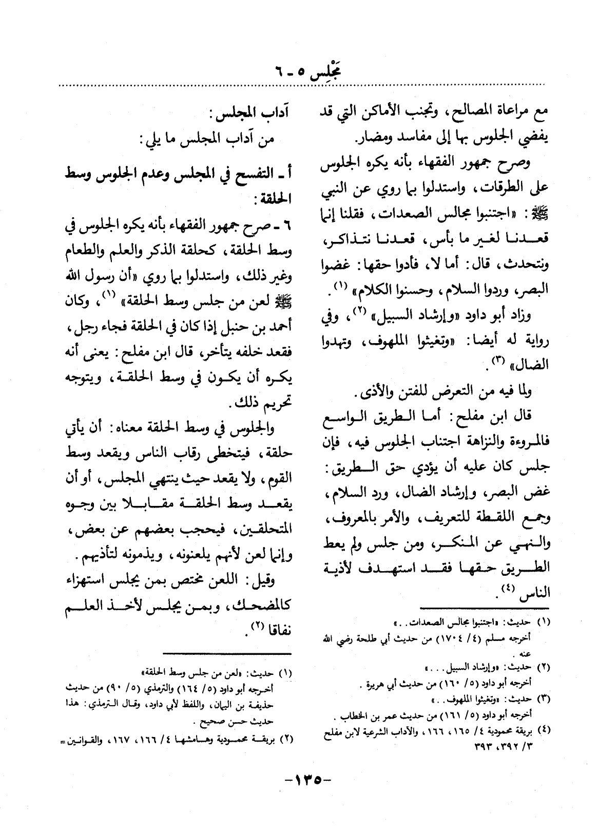 6 - صَرَّحَ جُمْهُورُ الْفُقَهَاءِ بِأَنَّهُ يُكْرَهُ الْجُلُوسُ فِي وَسْطِ الْحَلْقَةِ كَحَلْقَةِ الذِّكْرِ وَالْعِلْمِ وَالطَّعَامِ وَغَيْرِ ذَلِكَ وَاسْتَدَلُّوا بِمَا رُوِيَ أَنَّ رَسُول اللَّهِ صَلَّى اللَّهُ عَلَيْهِ وَسَلَّمَ لَعَنَ مَنْ جَلَسَ وَسْطَ الْحَلْقَةِ (1) وَكَانَ أَحْمَدُ بْنُ حَنْبَلٍ إِذَا كَانَ فِي الْحَلْقَةِ فَجَاءَ رَجُلٌ فَقَعَدَ خَلْفَهُ يَتَأَخَّرُ قَال ابْنُ مُفْلِحٍ: يَعْنِي أَنَّهُ يُكْرَهُ أَنْ يَكُونَ فِي وَسْطِ الْحَلْقَةِ وَيَتَوَجَّهَ تَحْرِيمُ ذَلِكَ.