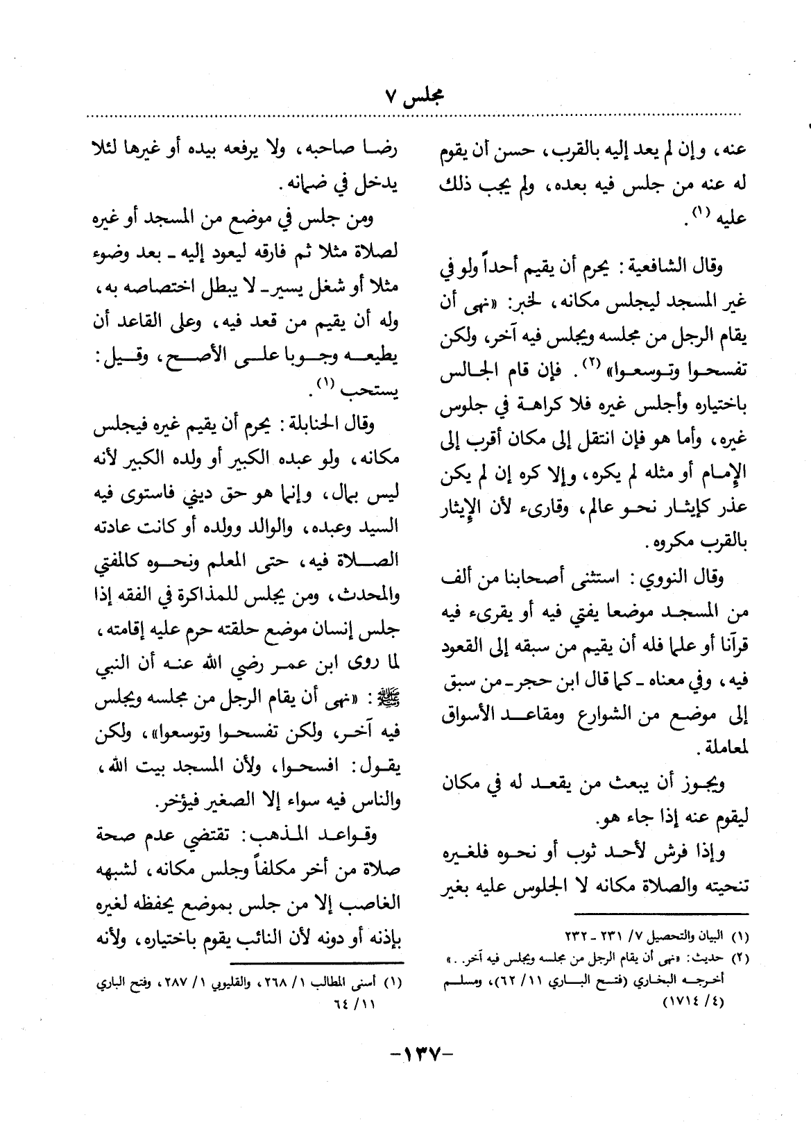 (2) حديث: " نهى أن يقام الرجل من مجلسه ويجلس فيه آخر. . ". أخرجه البخاري (فتح الباري 11 / 62) ، ومسلم (4 / 1714) .