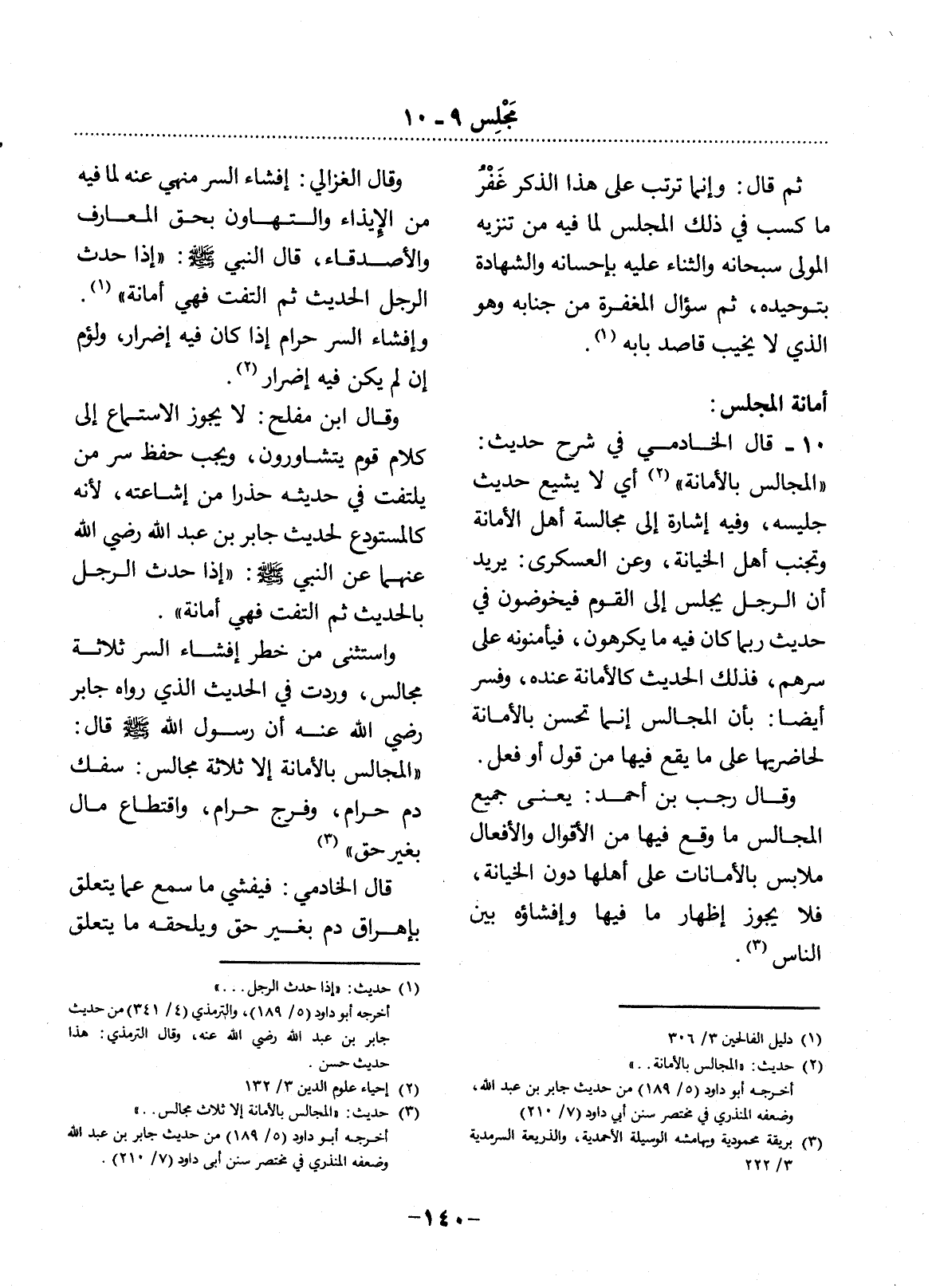 (2) حديث: " المجالس بالأمانة. . ". أخرجه أبو داود (5 / 189) من حديث جابر بن عبد الله، وضعفه المنذري في مختصر سنن أبي داود (7 / 210) .