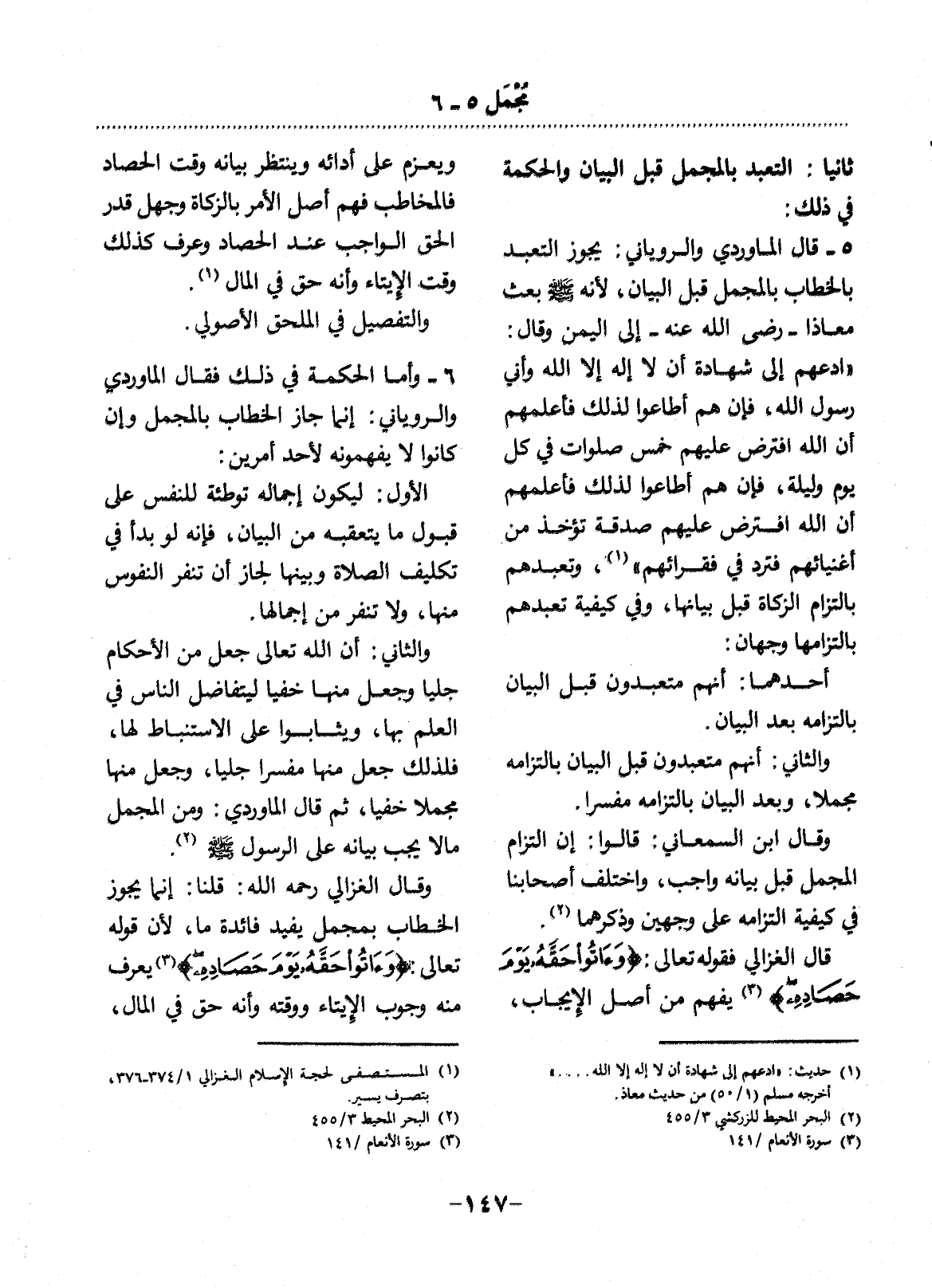 5 - قَال الْمَاوَرْدِيُّ وَالرُّويَانِيُّ: يَجُوزُ التَّعَبُّدُ بِالْخِطَابِ بِالْمُجْمَل قَبْل الْبَيَانِ لأَِنَّهُ صَلَّى اللَّهُ عَلَيْهِ وَسَلَّمَ بَعَثَ مُعَاذًا - رَضِيَ اللَّهُ عَنْهُ - إِلَى الْيَمَنِ وَقَال: ادْعُهُمْ إِلَى شَهَادَةِ أَنْ لاَ إِلَهَ إِلاَّ اللَّهُ وَأَنِّي رَسُول اللَّهِ فَإِنْ هُمْ أَطَاعُوا لِذَلِكَ فَأَعْلِمْهُمْ أَنَّ اللَّهَ افْتَرَضَ عَلَيْهِمْ خَمْسَ صَلَوَاتٍ فِي كُل يَوْمٍ وَلَيْلَةٍ، فَإِنْ هُمْ أَطَاعُوا لِذَلِكَ فَأَعْلِمْهُمْ أَنَّ اللَّهَ افْتَرَضَ عَلَيْهِمْ صَدَقَةً تُؤْخَذُ مِنْ أَغْنِيَائِهِمْ فَتُرَدَّ فِي فُقَرَائِهِمْ (1) وَتَعَبُّدُهُمْ بِالْتِزَامِ الزَّكَاةِ قَبْل بَيَانِهَا وَفِي كَيْفِيَّةِ تَعَبُّدِهِمْ بِالْتِزَامِهَا وَجْهَانِ: