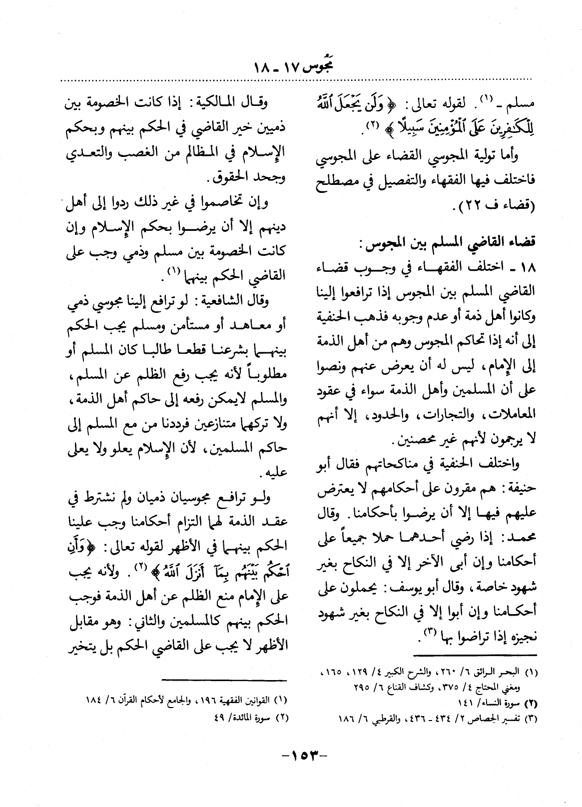 18 - اخْتَلَفَ الْفُقَهَاءُ فِي وُجُوبِ قَضَاءِ الْقَاضِي الْمُسْلِمِ بَيْنَ الْمَجُوسِ إِذَا تَرَافَعُوا إِلَيْنَا وَكَانُوا أَهْل ذِمَّةٍ أَوْ عَدَمِ وُجُوبِهِ، فَذَهَبَ الْحَنَفِيَّةُ إِلَى أَنَّهُ إِذَا تَحَاكَمَ الْمَجُوسُ وَهُمْ مِنْ أَهْل الذِّمَّةِ إِلَى الإِْمَامِ، لَيْسَ لَهُ أَنْ يُعْرِضَ عَنْهُمْ، وَنَصُّوا عَلَى أَنَّ الْمُسْلِمِينَ وَأَهْل الذِّمَّةِ سَوَاءٌ فِي عُقُودِ الْمُعَامَلاَتِ وَالتِّجَارَاتِ وَالْحُدُودِ، إِلاَّ أَنَّهُمْ لاَ يُرْجَمُونَ لأَِنَّهُمْ غَيْرُ مُحْصَنِينَ.