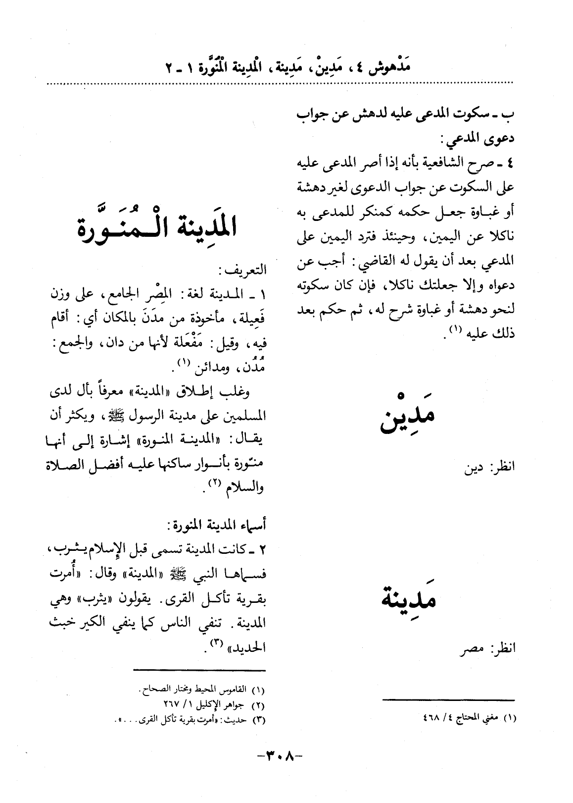 وَغَلَبَ إِطْلاَقُ " الْمَدِينَةِ " مُعَرَّفًا بِأَل لَدَى الْمُسْلِمِينَ عَلَى مَدِينَةِ الرَّسُول صَلَّى اللَّهُ عَلَيْهِ وَسَلَّمَ، وَيَكْثُرُ أَنْ يُقَال: " الْمَدِينَةُ الْمُنَوَّرَةُ " إِشَارَةً إِلَى أَنَّهَا مُنَوَّرَةٌ بِأَنْوَارِ سَاكِنِهَا عَلَيْهِ أَفْضَل الصَّلاَةِ وَالسَّلاَمُ (2) .