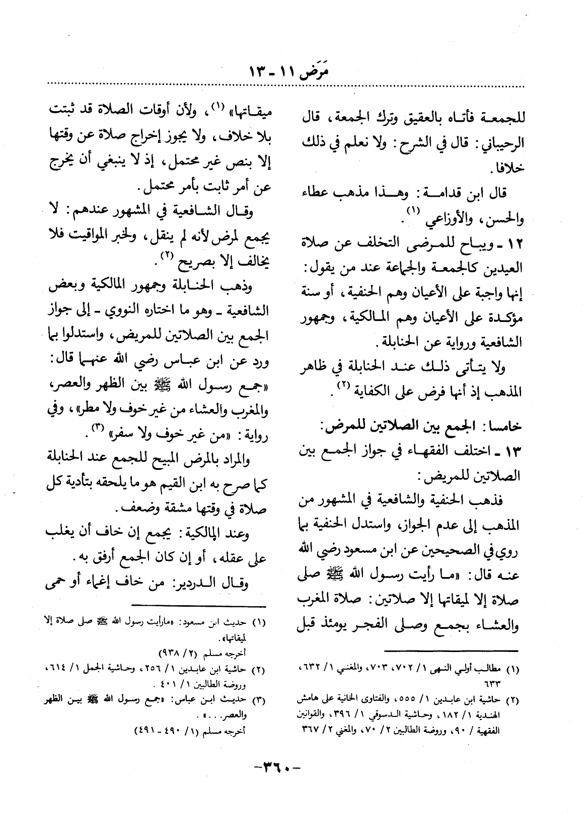 13 - اخْتَلَفَ الْفُقَهَاءُ فِي جَوَازِ الْجَمْعِ بَيْنَ الصَّلاَتَيْنِ لِلْمَرِيضِ: فَذَهَبَ الْحَنَفِيَّةُ وَالشَّافِعِيَّةُ فِي الْمَشْهُورِ مِنَ الْمَذْهَبِ إِلَى عَدَمِ الْجَوَازِ، وَاسْتَدَل الْحَنَفِيَّةُ بِمَا رُوِيَ فِي الصَّحِيحَيْنِ عَنِ ابْنِ مَسْعُودٍ رَضِيَ اللَّهُ عَنْهُ قَال: مَا رَأَيْتُ رَسُول اللَّهِ صَلَّى اللَّهُ عَلَيْهِ وَسَلَّمَ صَلَّى صَلاَةً إِلاَّ لِمِيقَاتِهَا إِلاَّ صَلاَتَيْنِ: صَلاَةَ الْمَغْرِبِ وَالْعِشَاءِ بِجَمْعٍ وَصَلَّى الْفَجْرَ يَوْمَئِذٍ قَبْل