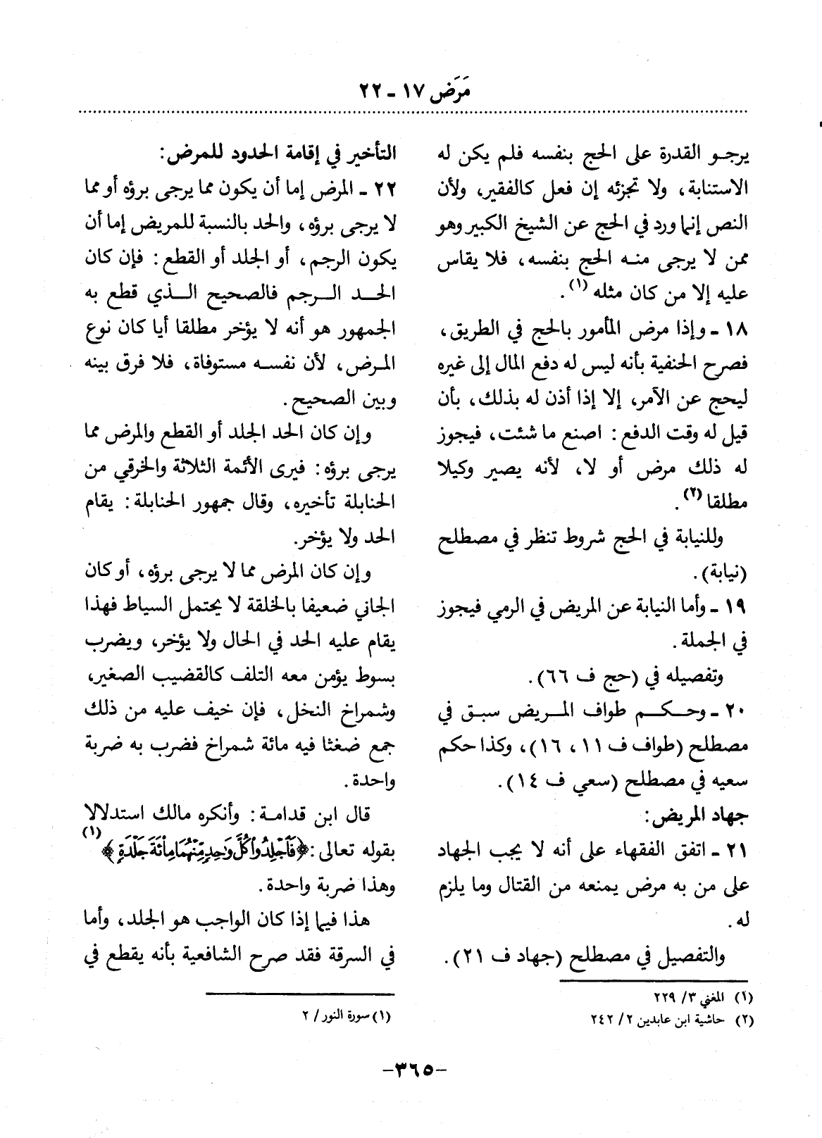 22 - الْمَرَضُ إِمَّا أَنْ يَكُونَ مِمَّا يُرْجَى بُرْؤُهُ أَوْ مِمَّا لاَ يُرْجَى بُرْؤُهُ، وَالْحَدُّ بِالنِّسْبَةِ لِلْمَرِيضِ إِمَّا أَنْ يَكُونَ الرَّجْمَ، أَوِ الْجَلْدَ أَوِ الْقَطْعَ: فَإِنْ كَانَ الْحَدُّ الرَّجْمَ فَالصَّحِيحُ الَّذِي قَطَعَ بِهِ الْجُمْهُورُ هُوَ أَنَّهُ لاَ يُؤَخَّرُ مُطْلَقًا أَيًّا كَانَ نَوْعُ الْمَرَضِ، لأَِنَّ نَفْسَهُ مُسْتَوْفَاةٌ، فَلاَ فَرْقَ بَيْنَهُ وَبَيْنَ الصَّحِيحِ.