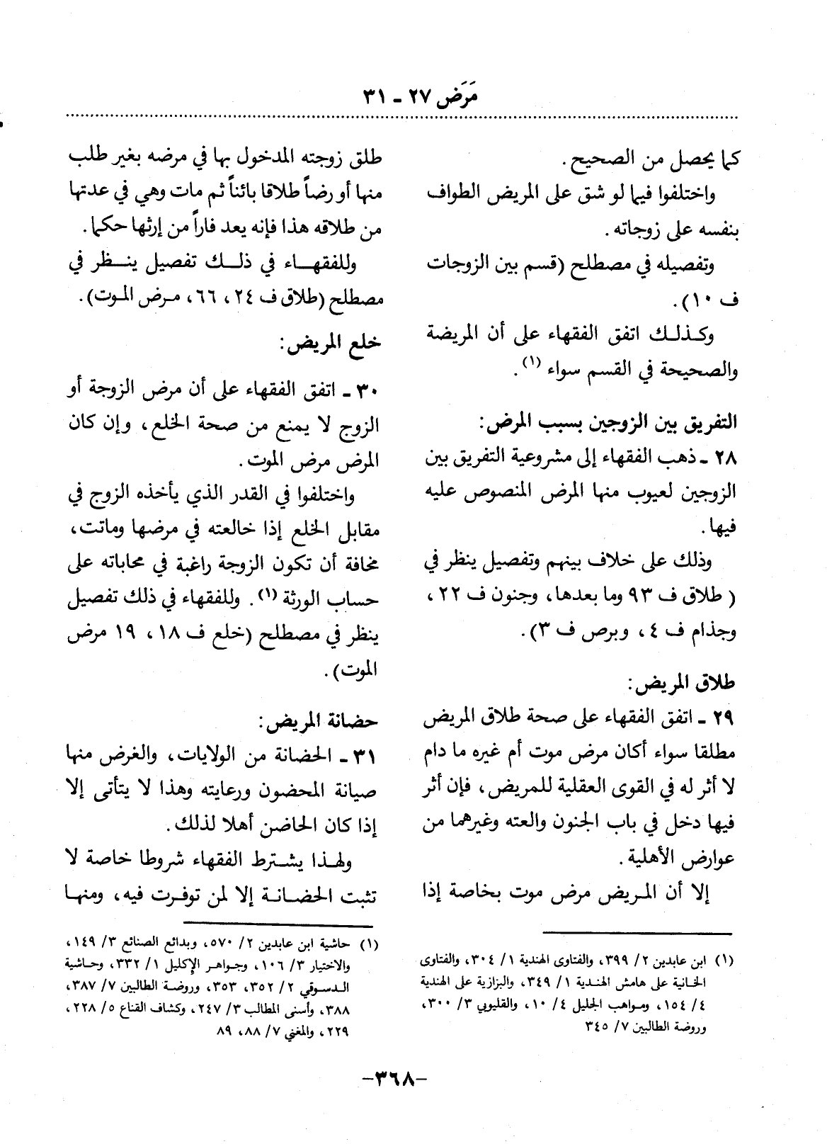 30 - اتَّفَقَ الْفُقَهَاءُ عَلَى أَنَّ مَرَضَ الزَّوْجَةِ أَوِ الزَّوْجِ لاَ يَمْنَعُ مِنْ صِحَّةِ الْخُلْعِ، وَإِنْ كَانَ الْمَرَضُ مَرَضَ الْمَوْتِ.
