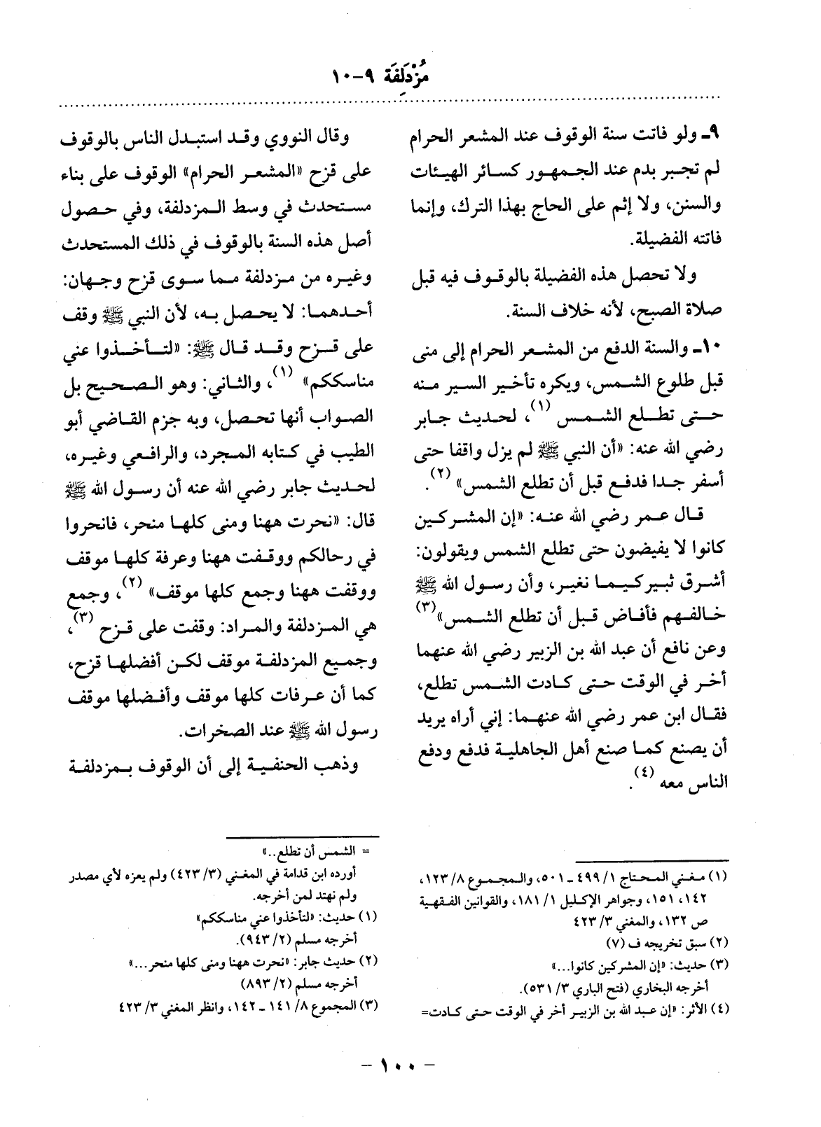10 - وَالسُّنَّةُ الدَّفْعُ مِنَ الْمَشْعَرِ الْحَرَامِ إِلَى مِنًى قَبْل طُلُوعِ الشَّمْسِ وَيُكْرَهُ تَأْخِيرُ السَّيْرِ مِنْهُ حَتَّى تَطْلُعَ الشَّمْسُ (1) ، لِحَدِيثِ جَابِرٍ رَضِيَ اللَّهُ عَنْهُ: أَنَّ النَّبِيَّ صَلَّى اللَّهُ عَلَيْهِ وَسَلَّمَ لَمْ يَزَل وَاقِفًا حَتَّى أَسْفَرَ جِدًّا فَدَفَعَ قَبْل أَنْ تَطْلُعَ الشَّمْسُ (2) .