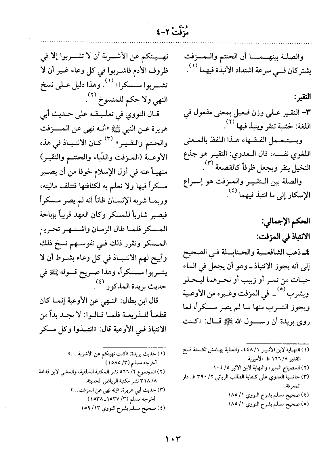 قَال النَّوَوِيُّ فِي تَعْلِيقِهِ عَلَى حَدِيثِ أَبِي هُرَيْرَةَ عَنِ النَّبِيِّ صَلَّى اللَّهُ عَلَيْهِ وَسَلَّمَ أَنَّهُ نَهَى عَنِ الْمُزَفَّتِ وَالْحَنْتَمِ وَالنَّقِيرِ (3) كَانَ الاِنْتِبَاذُ فِي هَذِهِ الأَْوْعِيَةِ (الْمُزَفَّتِ وَالدُّبَّاءِ وَالْحَنْتَمِ وَالنَّقِيرِ) مَنْهِيًّا عَنْهُ فِي أَوَّل الإِْسْلاَمِ خَوْفًا مِنْ أَنْ يَصِيرَ مُسْكِرًا فِيهَا وَلاَ نَعْلَمُ بِهِ لِكَثَافَتِهَا فَتُتْلِفُ مَالِيَّتَهُ، وَرُبَّمَا شَرِبَهُ الإِْنْسَانُ ظَانًّا أَنَّهُ لَمْ يَصِرْ مُسْكِرًا فَيَصِيرُ شَارِبًا لِلْمُسْكِرِ وَكَانَ الْعَهْدُ قَرِيبًا بِإِبَاحَةِ الْمُسْكِرِ فَلَمَّا طَال الزَّمَانُ وَاشْتُهِرَ تَحْرِيمُ الْمُسْكِرِ وَتَقَرَّرَ ذَلِكَ فِي نَفُوسِهِمْ نُسِخَ ذَلِكَ وَأُبِيحَ لَهُمُ الاِنْتِبَاذُ فِي كُل وِعَاءٍ بِشَرْطِ أَنْ لاَ يَشْرَبُوا مُسْكِرًا، وَهَذَا صَرِيحُ قَوْلِهِ صَلَّى اللَّهُ عَلَيْهِ وَسَلَّمَ فِي حَدِيثِ بُرَيْدَةُ الْمَذْكُورِ (4) .