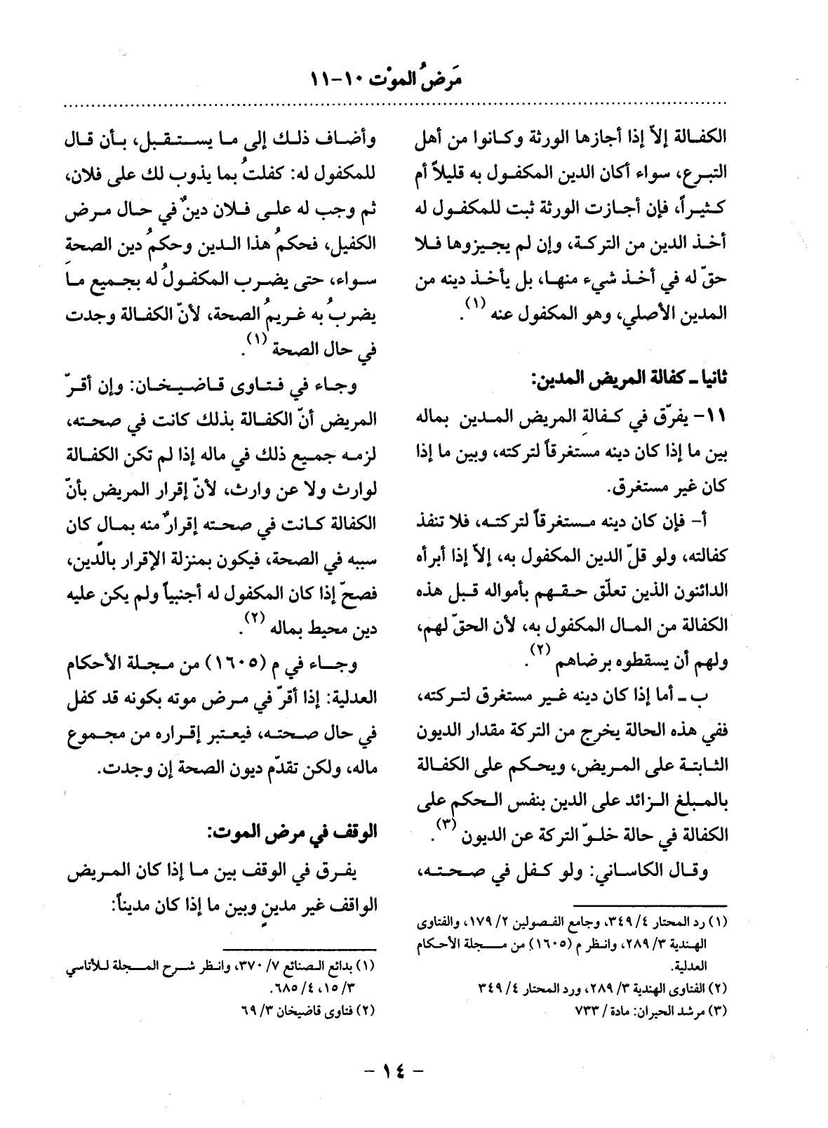 11 - يُفَرَّقُ فِي كَفَالَةِ الْمَرِيضِ الْمَدِينِ بِمَالِهِ بَيْنَ مَا إِذَا كَانَ دَيْنُهُ مُسْتَغْرِقًا لِتَرِكَتِهِ، وَبَيْنَ مَا إِذَا كَانَ غَيْرَ مُسْتَغْرِقٍ.