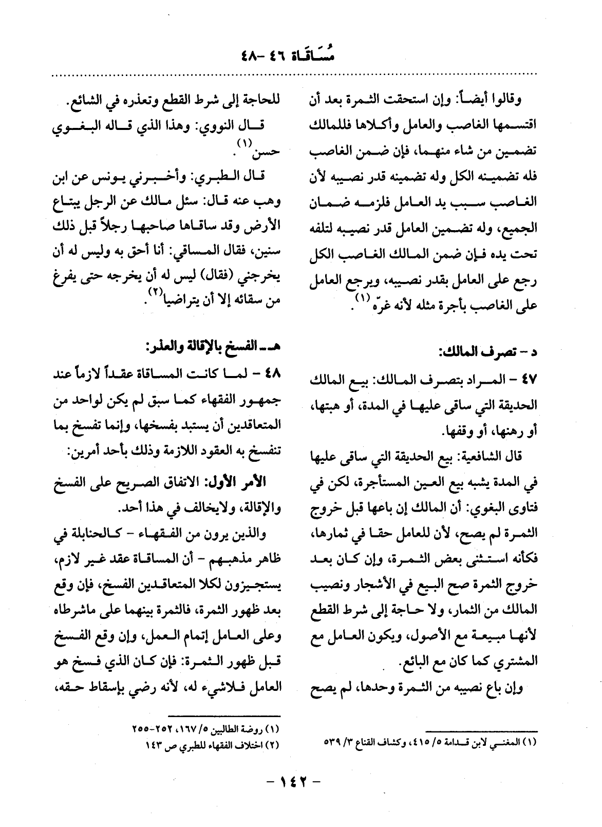 47 - الْمُرَادُ بِتَصَرُّفِ الْمَالِكِ: بَيْعُ الْمَالِكِ الْحَدِيقَةَ الَّتِي سَاقَى عَلَيْهَا فِي الْمُدَّةِ أَوْ هِبَتُهَا؛ أَوْ رَهْنُهَا، أَوْ وَقْفُهَا.