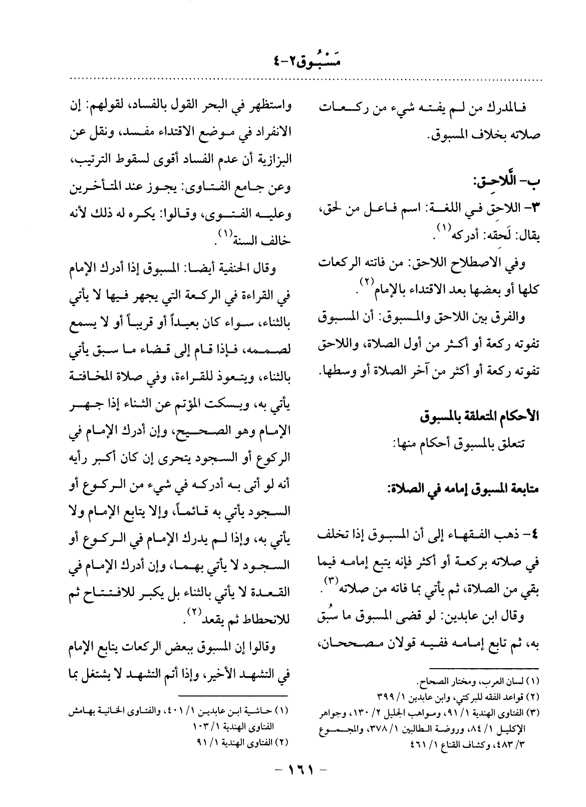 4 - ذَهَبَ الْفُقَهَاءُ إِلَى أَنَّ الْمَسْبُوقَ إِذَا تَخَلَّفَ فِي صَلاَتِهِ بِرَكْعَةٍ أَوْ أَكْثَرَ فَإِنَّهُ يَتْبَعُ إِمَامَهُ فِيمَا بَقِيَ مِنَ الصَّلاَةِ، ثُمَّ يَأْتِي بِمَا فَاتَهُ مِنْ صَلاَتِهِ (3) .