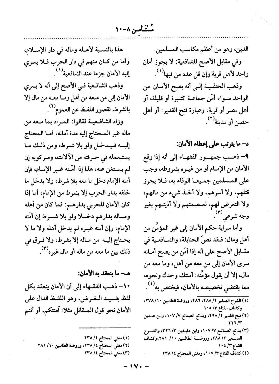 9 - ذَهَبَ جُمْهُورُ الْفُقَهَاءِ إِلَى أَنَّهُ إِذَا وَقَعَ الأَْمَانُ مِنَ الإِْمَامِ أَوْ مِنْ غَيْرِهِ بِشُرُوطِهِ، وَجَبَ عَلَى الْمُسْلِمِينَ جَمِيعًا الْوَفَاءُ بِهِ، فَلاَ يَجُوزُ قَتْلُهُمْ، وَلاَ أَسْرُهُمْ، وَلاَ أَخْذُ شَيْءٍ مِنْ مَالِهِمْ، وَلاَ التَّعَرُّضُ لَهُمْ، لِعِصْمَتِهِمْ، وَلاَ أَذِيَّتُهُمْ بِغَيْرِ وَجْهٍ شَرْعِيٍّ (3) .