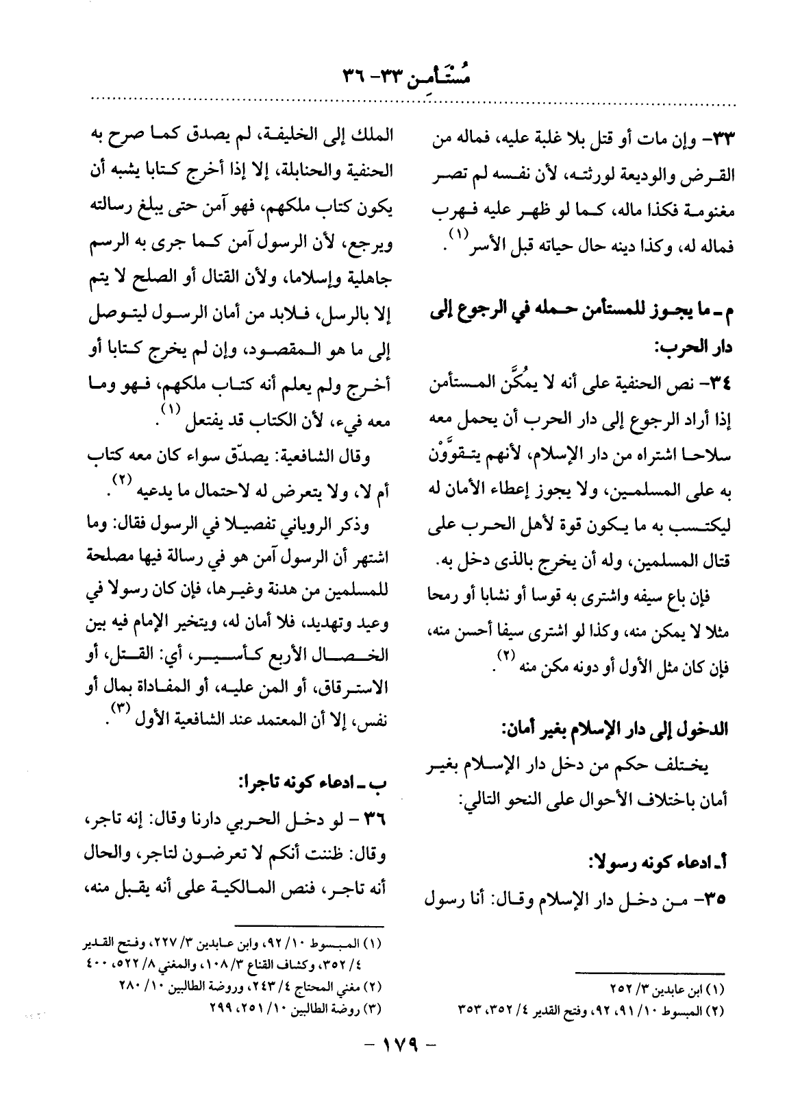 34 - نَصَّ الْحَنَفِيَّةُ عَلَى أَنَّهُ لاَ يُمَكَّنُ الْمُسْتَأْمِنُ إِذَا أَرَادَ الرُّجُوعَ إِلَى دَارِ الْحَرْبِ أَنْ يَحْمِل مَعَهُ سِلاَحًا اشْتَرَاهُ مِنْ دَارِ الإِْسْلاَمِ، لأَِنَّهُمْ يَتَقَوَّوْنَ بِهِ عَلَى الْمُسْلِمِينَ، وَلاَ يَجُوزُ إِعْطَاءُ الأَْمَانِ لَهُ لِيَكْتَسِبَ بِهِ مَا يَكُونُ قُوَّةً لأَِهْل الْحَرْبِ عَلَى قِتَال الْمُسْلِمِينَ، وَلَهُ أَنْ يَخْرُجَ بِالَّذِي دَخَل بِهِ. فَإِنْ بَاعَ سَيْفَهُ وَاشْتَرَى بِهِ قَوْسًا أَوْ نُشَّابًا أَوْ رُمْحًا مَثَلاً لاَ يُمَكَّنُ مِنْهُ، وَكَذَا لَوِ اشْتَرَى سَيْفًا أَحَسَنَ مِنْهُ، فَإِنْ كَانَ مِثْل الأَْوَّل أَوْ دُونَهُ مُكِّنَ مِنْهُ (2) .
