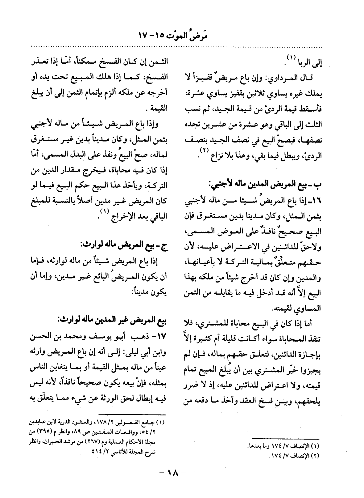 (1) جامع الفصولين 2 / 178، والعقود الدرية لابن عابدين 2 / 54، وواقعات المفتين ص89، وانظر م (395) من مجلة الأحكام العدلية وم (267) من مرشد الحيران، وانظر شرح المجلة للأتاسي 2 / 414.