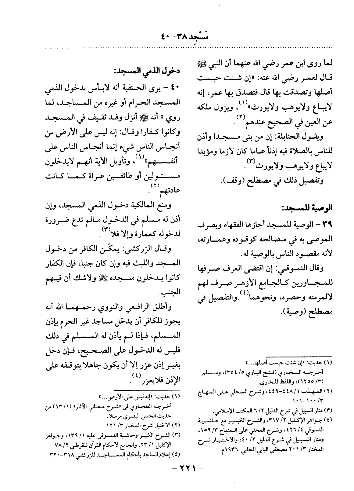 39 - الْوَصِيَّةُ لِلْمَسْجِدِ أَجَازَهَا الْفُقَهَاءُ وَيُصْرَفُ الْمُوصَى بِهِ فِي مَصَالِحِهِ كَوُقُودِهِ وَعِمَارَتِهِ، لأَِنَّهُ مَقْصُودُ النَّاسِ بِالْوَصِيَّةِ لَهُ.