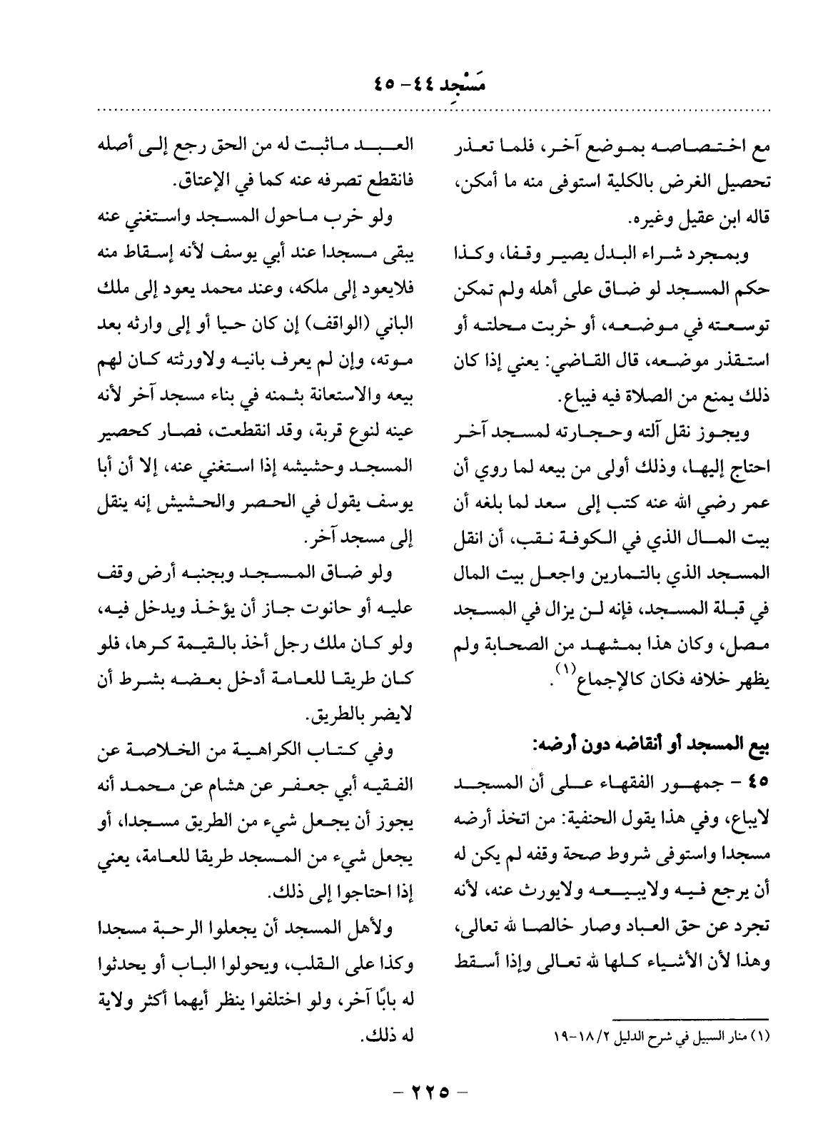 45 - جُمْهُورُ الْفُقَهَاءِ عَلَى أَنَّ الْمَسْجِدَ لاَ يُبَاعُ، وَفِي هَذَا يَقُول الْحَنَفِيَّةُ: مَنِ اتَّخَذَ أَرْضَهُ مَسْجِدًا وَاسْتَوْفَى شُرُوطَ صِحَّةِ وَقْفِهِ لَمْ يَكُنْ لَهُ أَنْ يَرْجِعَ فِيهِ وَلاَ يَبِيعَهُ وَلاَ يُورَثَ عَنْهُ، لأَِنَّهُ تَجَرَّدَ عَنْ حَقِّ الْعِبَادِ وَصَارَ خَالِصًا لِلَّهِ تَعَالَى، وَهَذَا لأَِنَّ الأَْشْيَاءَ كُلَّهَا لِلَّهِ تَعَالَى وَإِذَا أَسْقَطَ