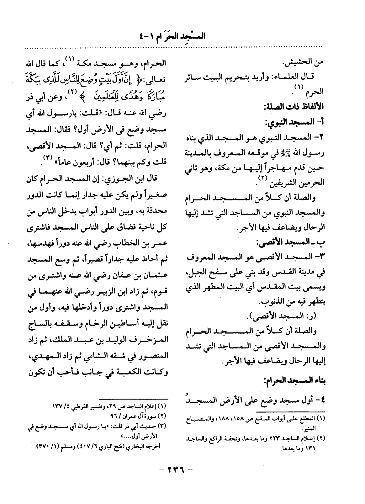 (3) حديث أبي ذر قلت: " يا رسول الله أي مسجد وضع في الأرض أول. . . ". أخرجه البخاري (فتح الباري 6 / 407) ومسلم (1 / 370) .
