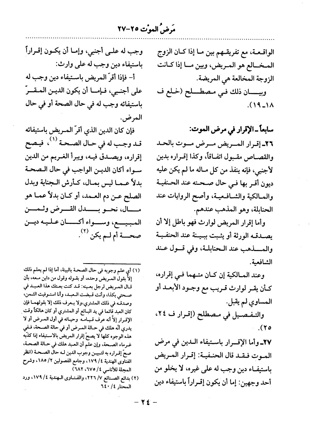 26 - إِقْرَارُ الْمَرِيضِ مَرَضَ مَوْتٍ بِالْحَدِّ وَالْقِصَاصِ مَقْبُولٌ اتِّفَاقًا، وَكَذَا إِقْرَارُهُ بِدَيْنٍ لأَِجْنَبِيٍّ، فَإِنَّهُ يَنْفُذُ مِنْ كُل مَالِهِ مَا لَمْ يَكُنْ عَلَيْهِ دُيُونٌ أَقَرَّ بِهَا فِي حَال صِحَّتِهِ عِنْدَ الْحَنَفِيَّةِ وَالْمَالِكِيَّةِ وَالشَّافِعِيَّةِ، وَأَصَحُّ الرِّوَايَاتِ عِنْدَ الْحَنَابِلَةِ، وَهُوَ الْمَذْهَبُ عِنْدَهُمْ.