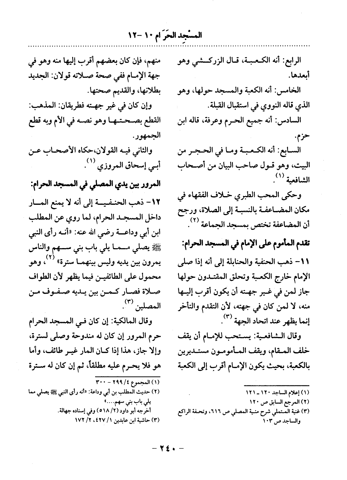 12 - ذَهَبَ الْحَنَفِيَّةُ إِلَى أَنَّهُ لاَ يُمْنَعُ الْمَارُّ دَاخِل الْمَسْجِدِ الْحَرَامِ، لِمَا رُوِيَ عَنِ الْمُطَّلِبِ ابْنِ أَبِي وَدَاعَةَ رَضِيَ اللَّهُ عَنْهُ: أَنَّهُ رَأَى النَّبِيَّ صَلَّى اللَّهُ عَلَيْهِ وَسَلَّمَ يُصَلِّي مِمَّا يَلِي بَابَ بَنِي سَهْمٍ وَالنَّاسُ يَمُرُّونَ بَيْنَ يَدَيْهِ وَلَيْسَ بَيْنَهُمَا سُتْرَةٌ (2) ، وَهُوَ مَحْمُولٌ عَلَى الطَّائِفِينَ فِيمَا يَظْهَرُ لأَِنَّ الطَّوَافَ صَلاَةٌ فَصَارَ كَمَنْ بَيْنَ يَدَيْهِ صُفُوفٌ مِنَ الْمُصَلِّينَ (3) .