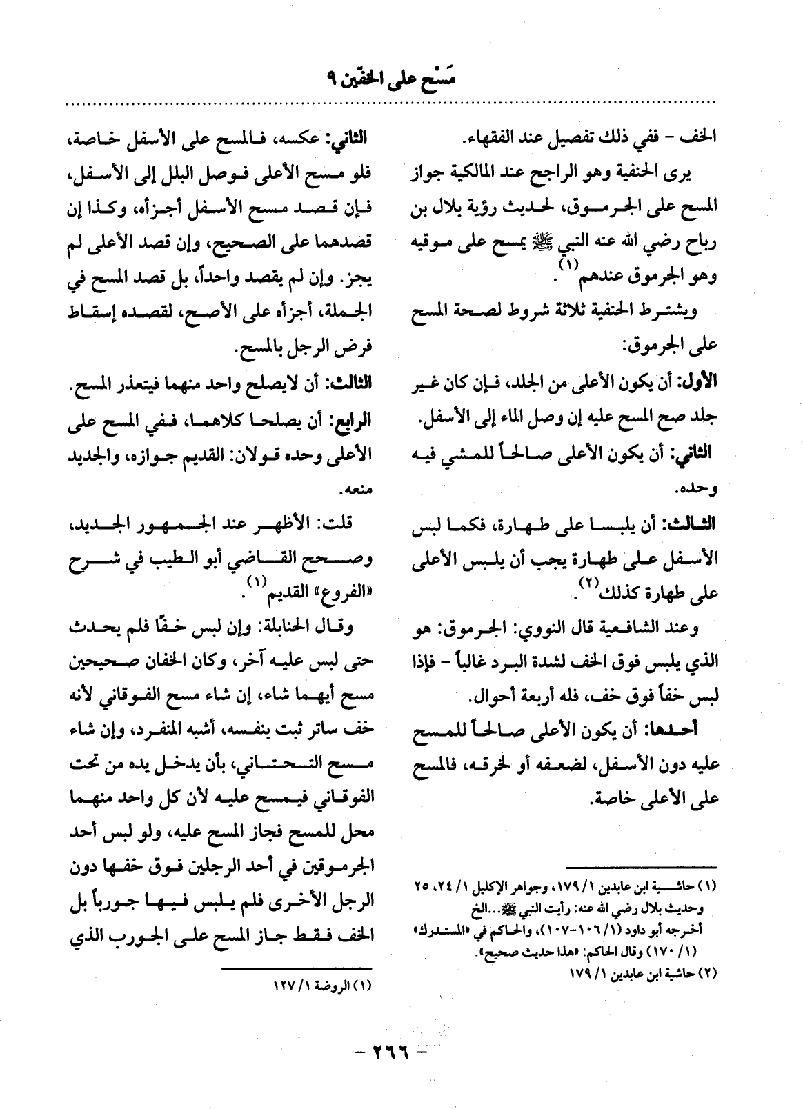 (1) حاشية ابن عابدين 1 / 179، وجواهر الإكليل 1 / 24، 25 وحديث بلال رضي الله عنه: رأيت النبي صلى الله عليه وسلم. . الخ. أخرجه أبو داود (1 / 106 - 107) ، والحاكم في " المستدرك " (1 / 170) وقال الحاكم: " هذا حديث صحيح ".