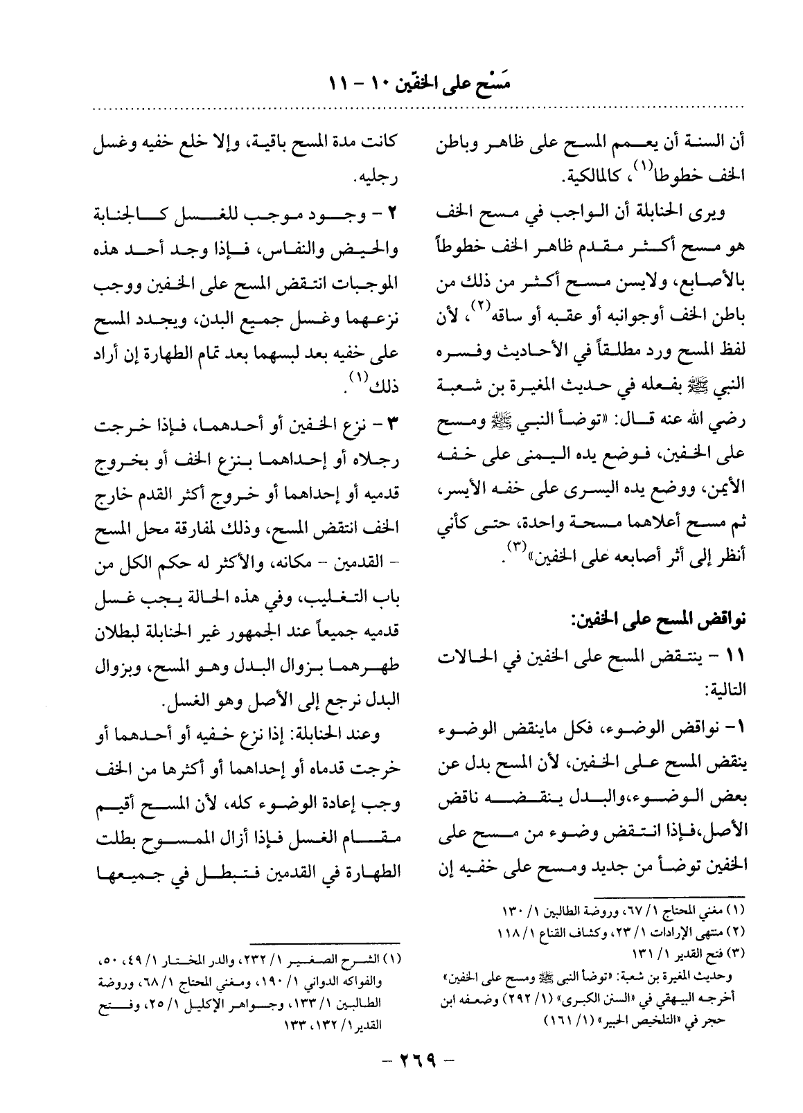 (3) فتح القدير 1 / 131. وحديث المغيرة بن شعبة: " توضأ النبي صلى الله عليه وسلم ومسح على الخفين ". أخرجه البيهقي في " السنن الكبرى " (1 / 292) وضعفه ابن حجر في " التلخيص الحبير " (1 / 161) .