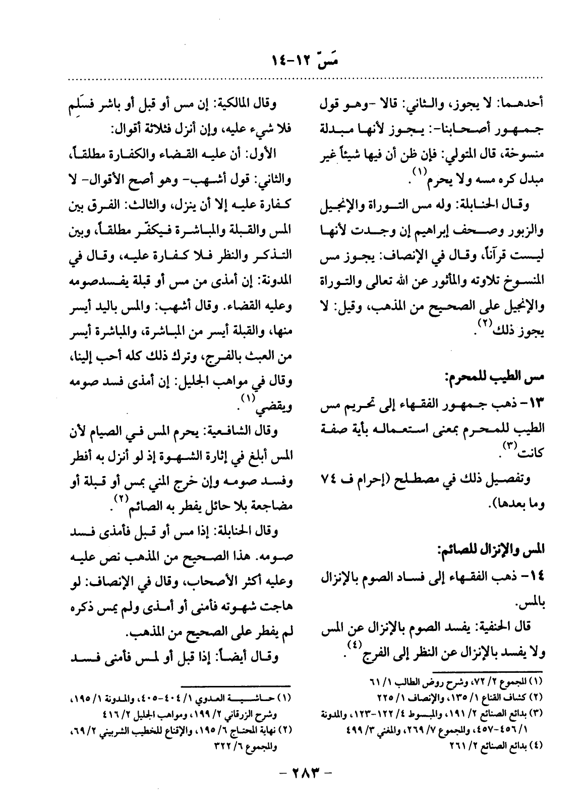 (1) حاشية العدوي 1 / 404 - 405، والمدونة 1 / 195، وشرح الزرقاني 2 / 199، ومواهب الجليل 2 / 416.