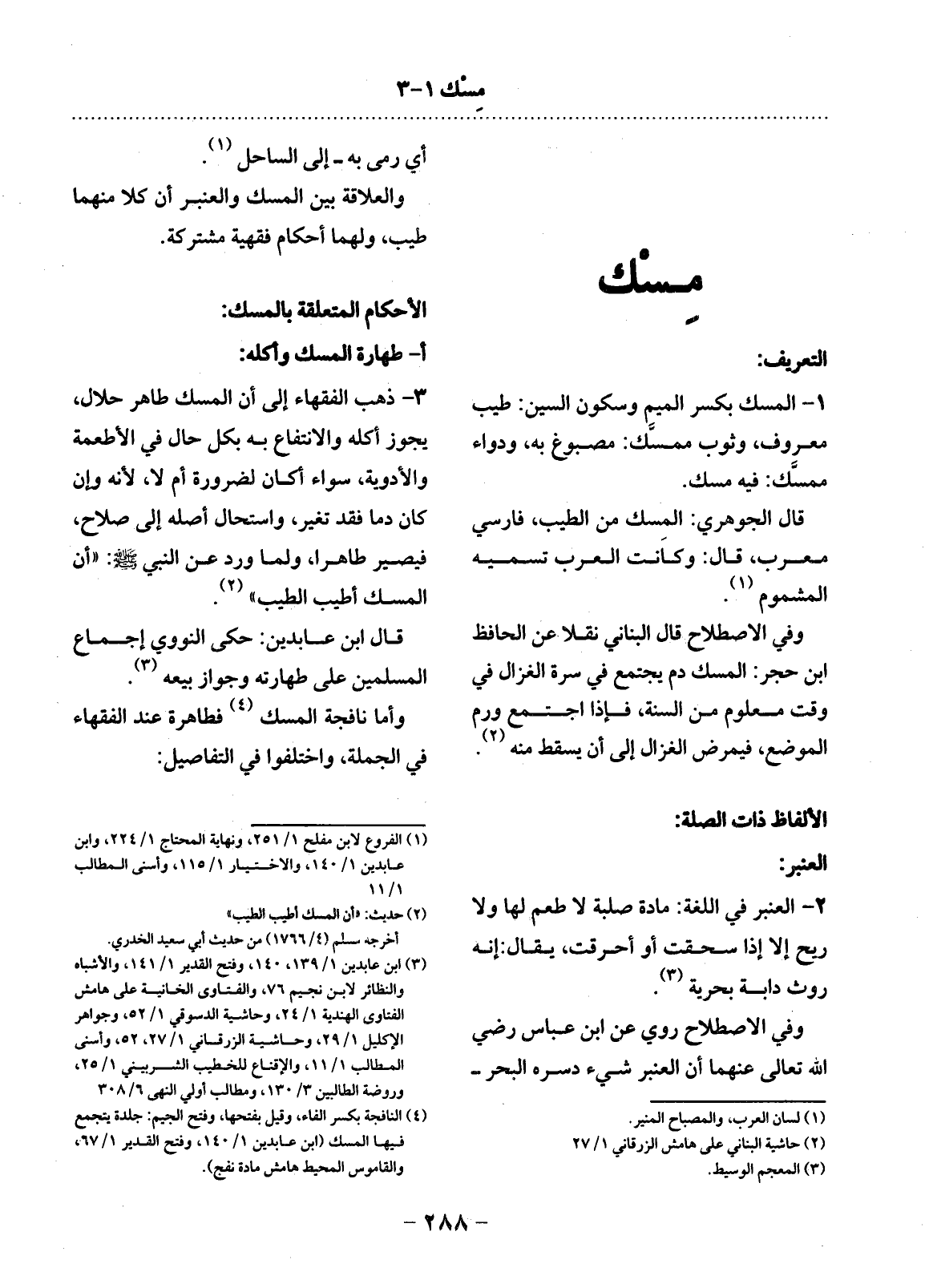 1 - الْمِسْكُ بِكَسْرِ الْمِيمِ وَسُكُونِ السِّينِ: طِيبٌ مَعْرُوفٌ، وَثَوْبٌ مُمَسَّكٌ: مَصْبُوغٌ بِهِ، وَدَوَاءٌ مُمَسَّكٌ: فِيهِ مِسْكٌ.