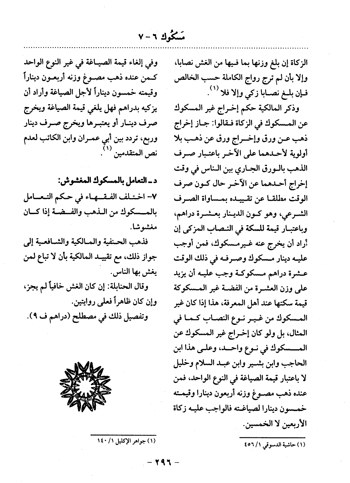 وَفِي إِلْغَاءِ قِيمَةِ الصِّيَاغَةِ فِي غَيْرِ النَّوْعِ الْوَاحِدِ كَمَنْ عِنْدَهُ ذَهَبٌ مَصُوغٌ وَزْنُهُ أَرْبَعُونَ دِينَارًا وَقِيمَتُهُ خَمْسُونَ دِينَارًا لأَِجْل الصِّيَاغَةِ وَأَرَادَ أَنْ يُزَكِّيَهُ بِدَرَاهِمَ فَهَل يُلْغِي قِيمَةَ الصِّيَاغَةِ وَيُخْرِجُ صَرْفَ دِينَارٍ أَوْ يَعْتَبِرُهَا وَيُخْرِجُ صَرْفَ دِينَارٍ وَرُبْعٍ، تَرَدُّدٌ بَيْنَ أَبِي عِمْرَانَ وَابْنِ الْكَاتِبِ لِعَدَمِ نَصِّ الْمُتَقَدِّمِينَ (1) .