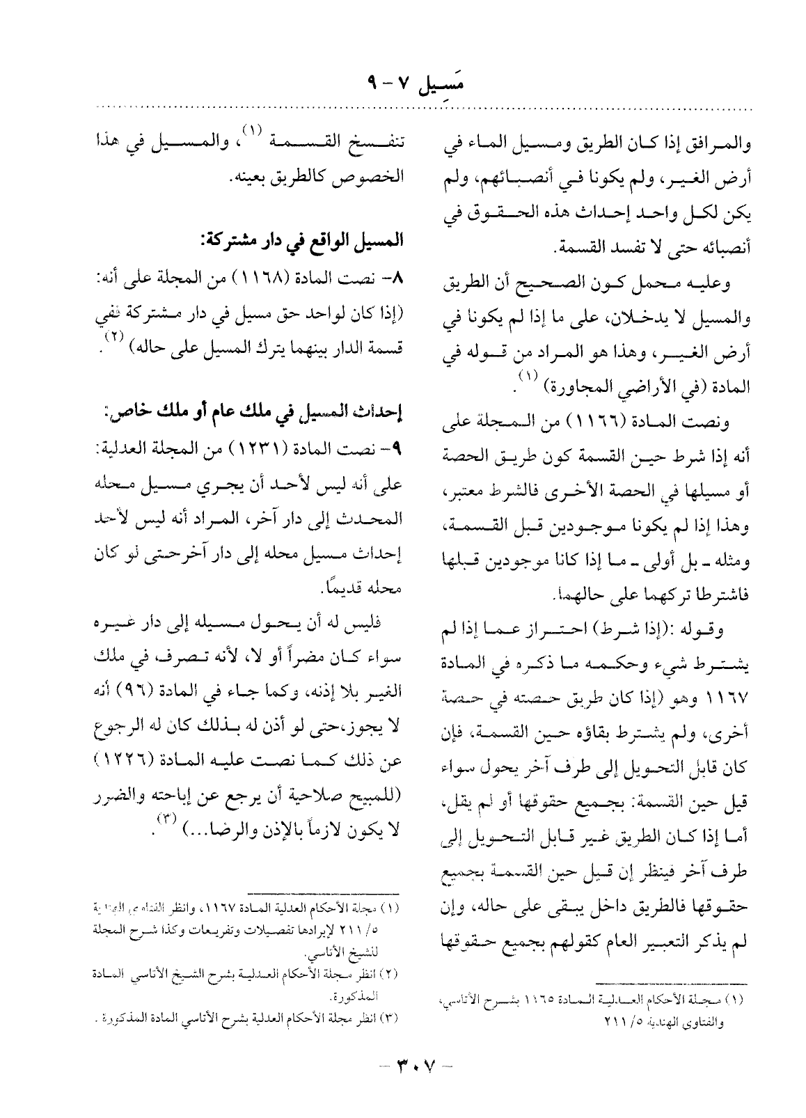 8 - نَصَّتِ الْمَادَّةُ (1168) مِنَ الْمَجَلَّةِ عَلَى أَنَّهُ: (إِذَا كَانَ لِوَاحِدٍ حَقُّ مَسِيلٍ فِي دَارٍ مُشْتَرَكَةٍ فَفِي قِسْمَةِ الدَّارِ بَيْنَهُمَا يُتْرَكُ الْمَسِيل عَلَى حَالِهِ) (2) .