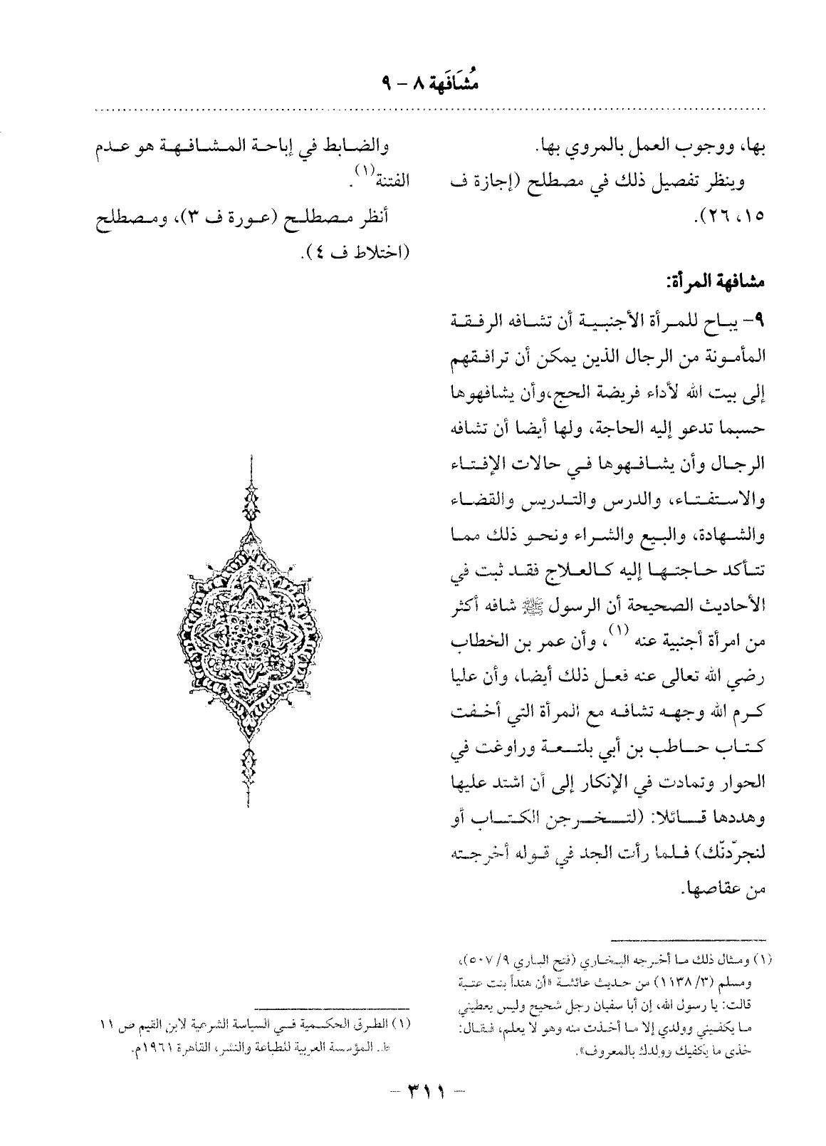9 - يُبَاحُ لِلْمَرْأَةِ الأَْجْنَبِيَّةِ أَنْ تُشَافِهَ الرُّفْقَةَ الْمَأْمُونَةَ مِنَ الرِّجَال الَّذِينَ يُمْكِنُ أَنْ تُرَافِقَهُمْ إِلَى بَيْتِ اللَّهِ لأَِدَاءِ فَرِيضَةِ الْحَجِّ، وَأَنْ يُشَافِهُوهَا حَسْبَمَا تَدْعُو إِلَيْهِ الْحَاجَةُ، وَلَهَا أَيْضًا أَنْ تُشَافِهَ الرِّجَال وَأَنْ يُشَافِهُوهَا فِي حَالاَتِ الإِْفْتَاءِ وَالاِسْتِفْتَاءِ، وَالدَّرْسِ وَالتَّدْرِيسِ وَالْقَضَاءِ وَالشَّهَادَةِ وَالْبَيْعِ وَالشِّرَاءِ وَنَحْوِ ذَلِكَ مِمَّا تَتَأَكَّدُ حَاجَتُهَا إِلَيْهِ كَالْعِلاَجِ فَقَدْ ثَبَتَ فِي الأَْحَادِيثِ الصَّحِيحَةِ أَنَّ الرَّسُول صَلَّى اللَّهُ عَلَيْهِ وَسَلَّمَ شَافَهَ أَكْثَرَ مِنِ امْرَأَةٍ أَجْنَبِيَّةٍ عَنْهُ (1) ، وَأَنَّ عُمَرَ بْنَ الْخَطَّابِ رَضِيَ اللَّهُ تَعَالَى عَنْهُ فَعَل ذَلِكَ أَيْضًا، وَأَنَّ عَلِيًّا كَرَّمَ اللَّهُ وَجْهَهُ تَشَافَهَ مَعَ الْمَرْأَةِ الَّتِي أَخْفَتْ كِتَابَ حَاطِبِ بْنِ أَبِي بَلْتَعَةَ وَرَاوَغَتْ فِي الْحِوَارِ وَتَمَادَتْ فِي الإِْنْكَارِ إِلَى أَنِ اشْتَدَّ عَلَيْهَا وَهَدَّدَهَا قَائِلاً: (لَتُخْرِجِنَّ الْكِتَابَ أَوْ لأَُجَرِّدَنَّكِ) فَلَمَّا رَأَتِ الْجِدَّ فِي قَوْلِهِ أَخْرَجَتْهُ مِنْ عِقَاصِهَا.