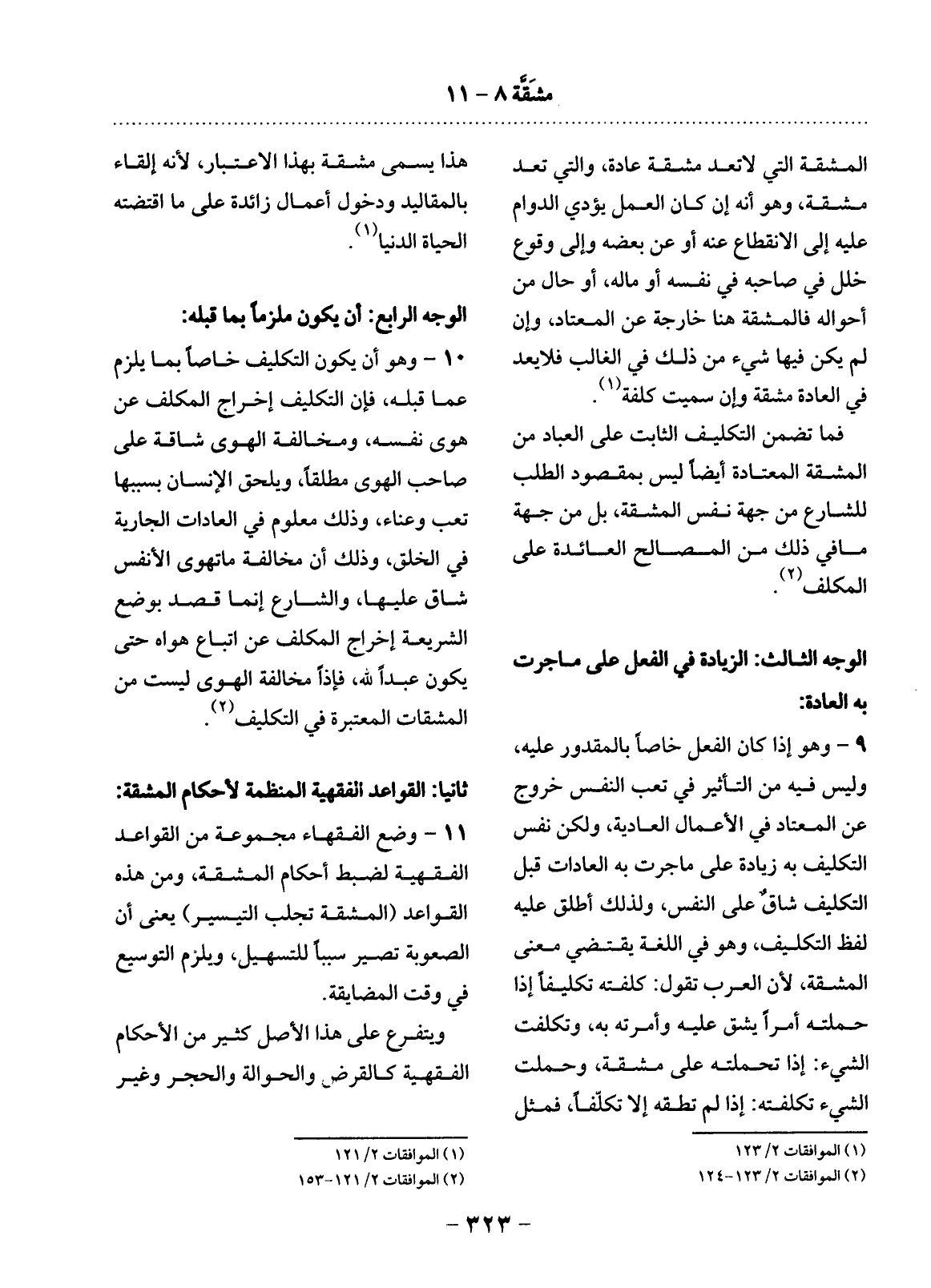الْمَشَقَّةِ الَّتِي لاَ تُعَدُّ مَشَقَّةً عَادَةً، وَالَّتِي تُعَدُّ مَشَقَّةً، وَهُوَ أَنَّهُ إِنْ كَانَ الْعَمَل يُؤَدِّي الدَّوَامُ عَلَيْهِ إِلَى الاِنْقِطَاعِ عَنْهُ أَوْ عَنْ بَعْضِهِ وَإِلَى وُقُوعِ خَلَلٍ فِي صَاحِبِهِ فِي نَفْسِهِ أَوْ مَالٍ، أَوْ حَالٍ مِنْ أَحْوَالِهِ فَالْمَشَقَّةُ هُنَا خَارِجَةٌ عَنِ الْمُعْتَادِ، وَإِنْ لَمْ يَكُنْ فِيهَا شَيْءٌ مِنْ ذَلِكَ فِي الْغَالِبِ فَلاَ يُعَدُّ فِي الْعَادَةِ مَشَقَّةً وَإِنْ سُمِّيَتْ كُلْفَةً (1) .