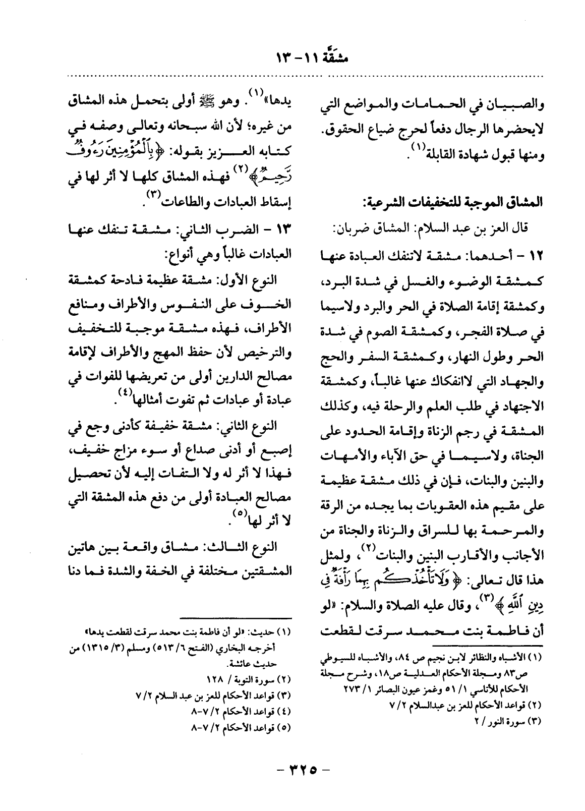 12 - أَحَدُهُمَا: مَشَقَّةٌ لاَ تَنْفَكُّ الْعِبَادَةُ عَنْهَا كَمَشَقَّةِ الْوُضُوءِ وَالْغُسْل فِي شِدَّةِ الْبَرْدِ، وَكَمَشَقَّةِ إِقَامَةِ الصَّلاَةِ فِي الْحَرِّ وَالْبَرْدِ وَلاَ سِيَّمَا فِي صَلاَةِ الْفَجْرِ، وَكَمَشَقَّةِ الصَّوْمِ فِي شِدَّةِ الْحَرِّ وَطُول النَّهَارِ، وَكَمَشَقَّةِ السَّفَرِ وَالْحَجِّ وَالْجِهَادِ الَّتِي لاَ انْفِكَاكَ عَنْهَا غَالِبًا، وَكَمَشَقَّةِ الاِجْتِهَادِ فِي طَلَبِ الْعِلْمِ وَالرِّحْلَةِ فِيهِ، وَكَذَلِكَ الْمَشَقَّةُ فِي رَجْمِ الزُّنَاةِ وَإِقَامَةِ الْحُدُودِ عَلَى الْجُنَاةِ وَلاَ سِيَّمَا فِي حَقِّ الآْبَاءِ وَالأُْمَّهَاتِ وَالْبَنِينَ وَالْبَنَاتِ، فَإِنَّ فِي ذَلِكَ مَشَقَّةً عَظِيمَةً عَلَى مُقِيمِ هَذِهِ الْعُقُوبَاتِ بِمَا يَجِدُهُ مِنَ الرِّقَّةِ وَالْمَرْحَمَةِ بِهَا لِلسُّرَّاقِ وَالزُّنَاةِ وَالْجُنَاةِ مِنَ الأَْجَانِبِ وَالأَْقَارِبِ الْبَنِينَ وَالْبَنَاتِ (2) ، وَلِمِثْل هَذَا قَال تَعَالَى: {وَلاَ تَأْخُذْكُمْ بِهِمَا رَأْفَةٌ فِي دِينِ اللَّهِ} (3) ، وَقَال عَلَيْهِ الصَّلاَةُ وَالسَّلاَمُ: لَوْ أَنَّ فَاطِمَةَ بِنْتَ مُحَمَّدٍ سَرَقَتْ لَقَطَعْتُ
