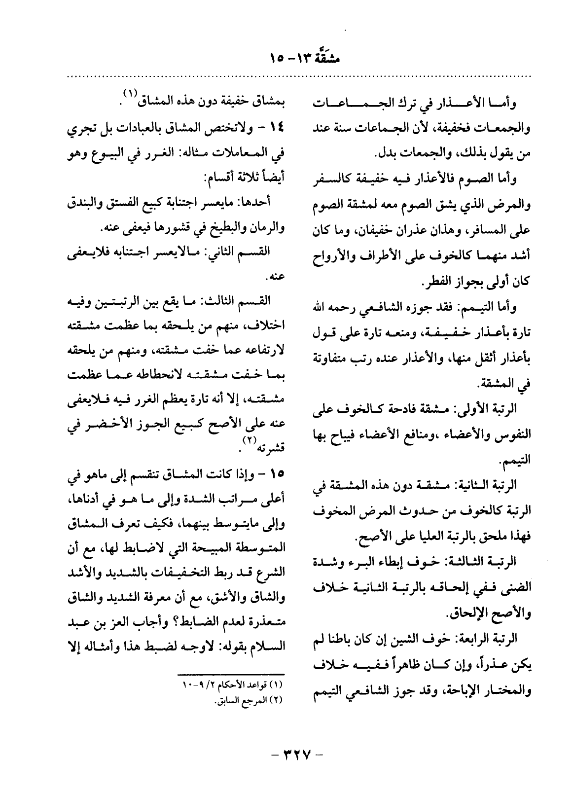 15 - وَإِذَا كَانَتِ الْمَشَاقُّ تَنْقَسِمُ إِلَى مَا هُوَ فِي أَعْلَى مَرَاتِبِ الشِّدَّةِ وَإِلَى مَا هُوَ فِي أَدْنَاهَا، وَإِلَى مَا يَتَوَسَّطُ بَيْنَهُمَا، فَكَيْفَ تُعْرَفُ الْمَشَاقُّ الْمُتَوَسِّطَةُ الْمُبِيحَةُ الَّتِي لاَ ضَابِطَ لَهَا، مَعَ أَنَّ الشَّرْعَ قَدْ رَبَطَ التَّخْفِيفَاتِ بِالشَّدِيدِ وَالأَْشَدِّ وَالشَّاقِّ وَالأَْشَقِّ، مَعَ أَنَّ مَعْرِفَةَ الشَّدِيدِ وَالشَّاقِّ مُتَعَذِّرَةٌ لِعَدَمِ الضَّابِطِ؟ وَأَجَابَ الْعِزُّ بْنُ عَبْدِ السَّلاَمِ بِقَوْلِهِ: لاَ وَجْهَ لِضَبْطِ هَذَا وَأَمْثَالِهِ إِلاَّ
