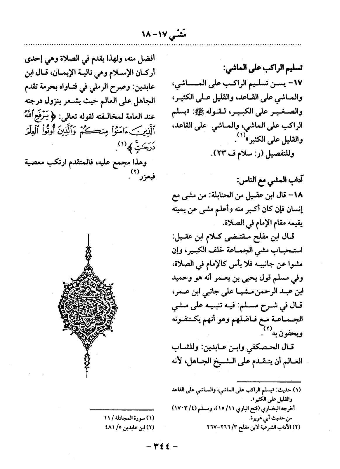 17 - يُسَنُّ تَسْلِيمُ الرَّاكِبِ عَلَى الْمَاشِي وَالْمَاشِي عَلَى الْقَاعِدِ، وَالْقَلِيل عَلَى الْكَثِيرِ، وَالصَّغِيرُ عَلَى الْكَبِيرِ، لِقَوْلِهِ صَلَّى اللَّهُ عَلَيْهِ وَسَلَّمَ: يُسَلِّمُ الرَّاكِبُ عَلَى الْمَاشِي، وَالْمَاشِي عَلَى الْقَاعِدِ، وَالْقَلِيل عَلَى الْكَثِيرِ (1) .