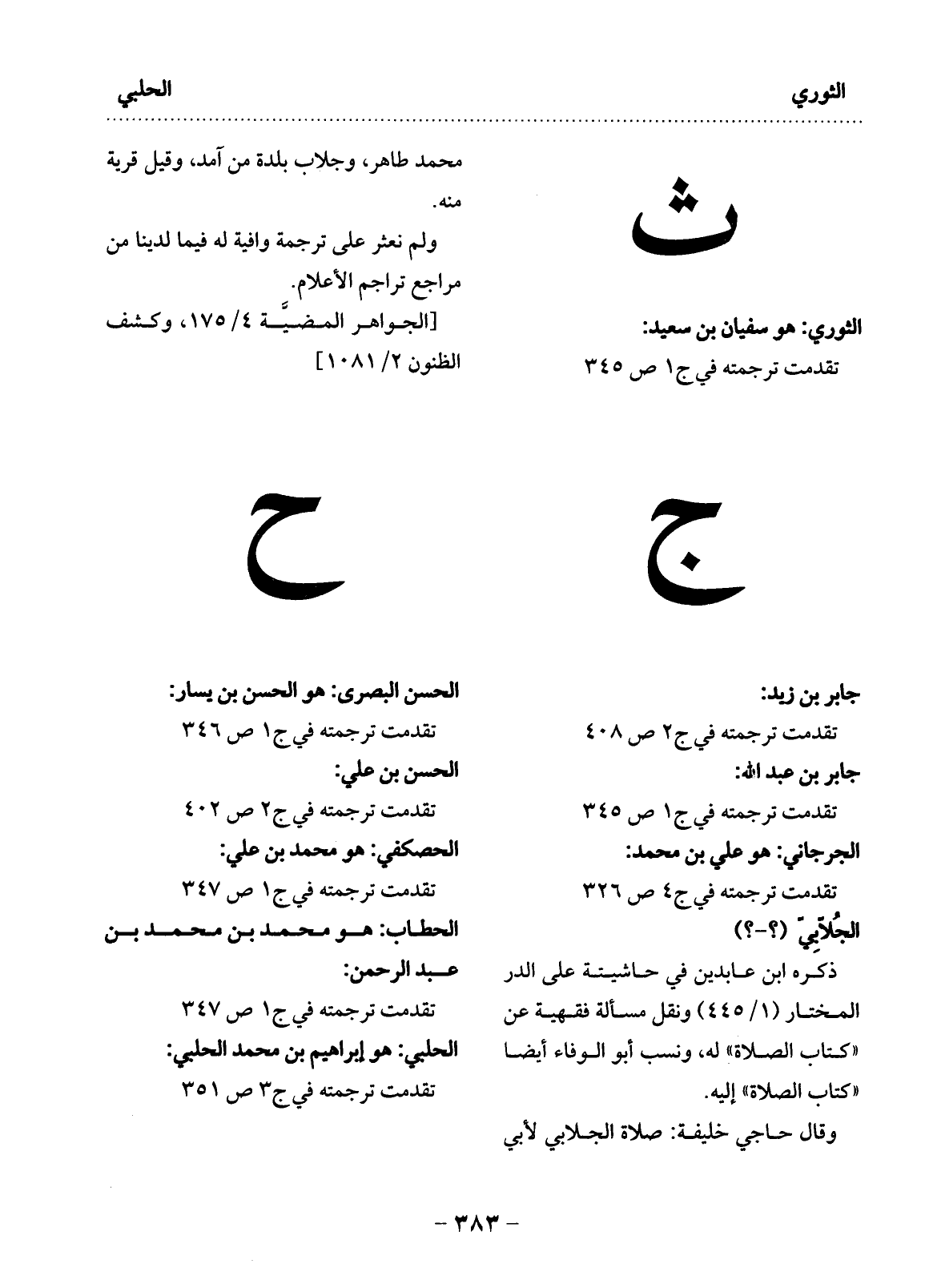 ذكره ابن عابدين في حاشيته على الدر المختار (1 / 445) ونقل مسألة فقهية عن " كتاب الصلاة " له، ونسب أبو الوفاء أيضًا " كتاب الصلاة " إليه. وقال حاجي خليفة: صلاة الجلابي لأبي