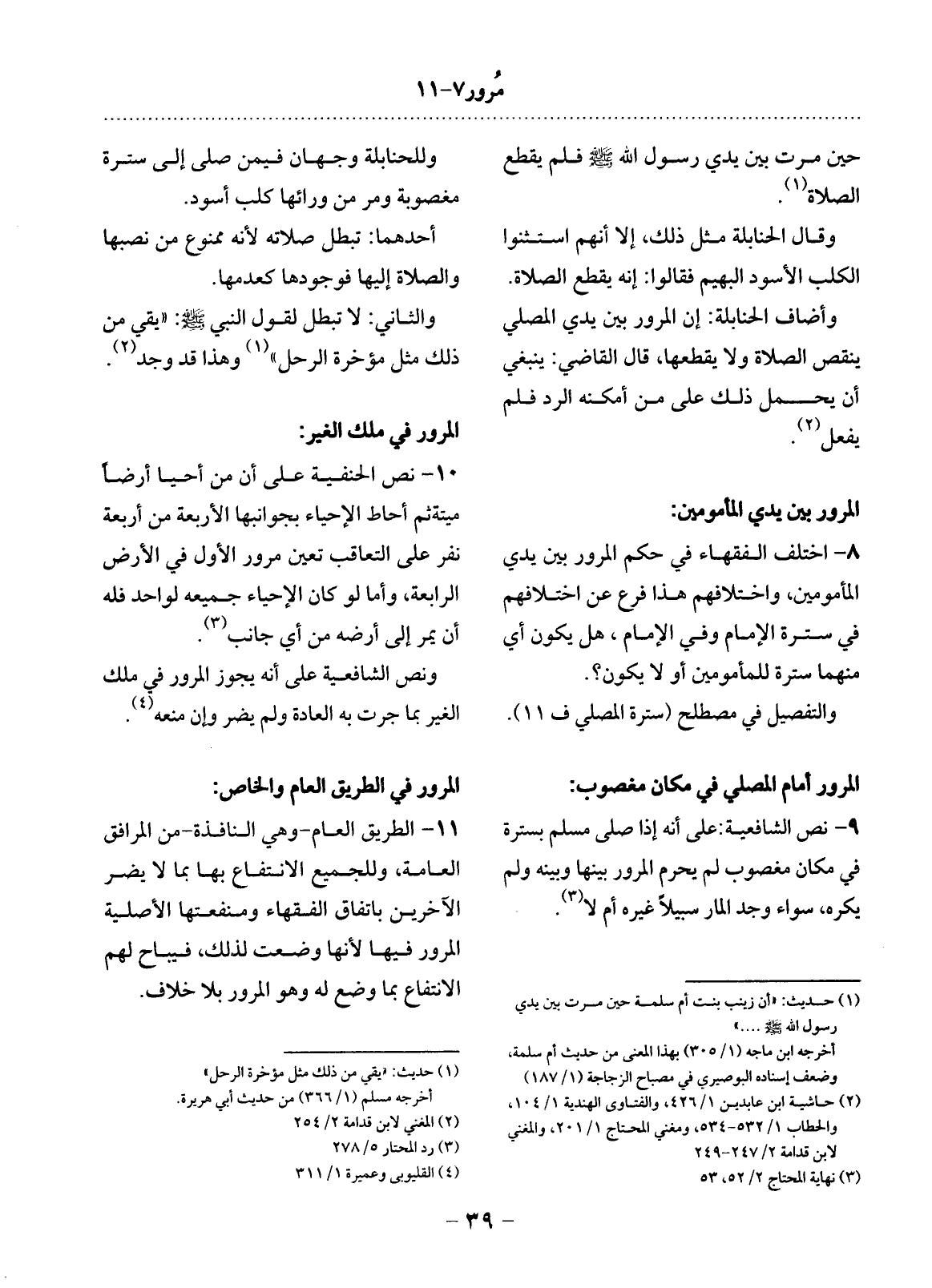 حِينَ مَرَّتْ بَيْنَ يَدَيْ رَسُول اللَّهِ صَلَّى اللَّهُ عَلَيْهِ وَسَلَّمَ فَلَمْ يَقْطَعِ الصَّلاَةَ (1) .
