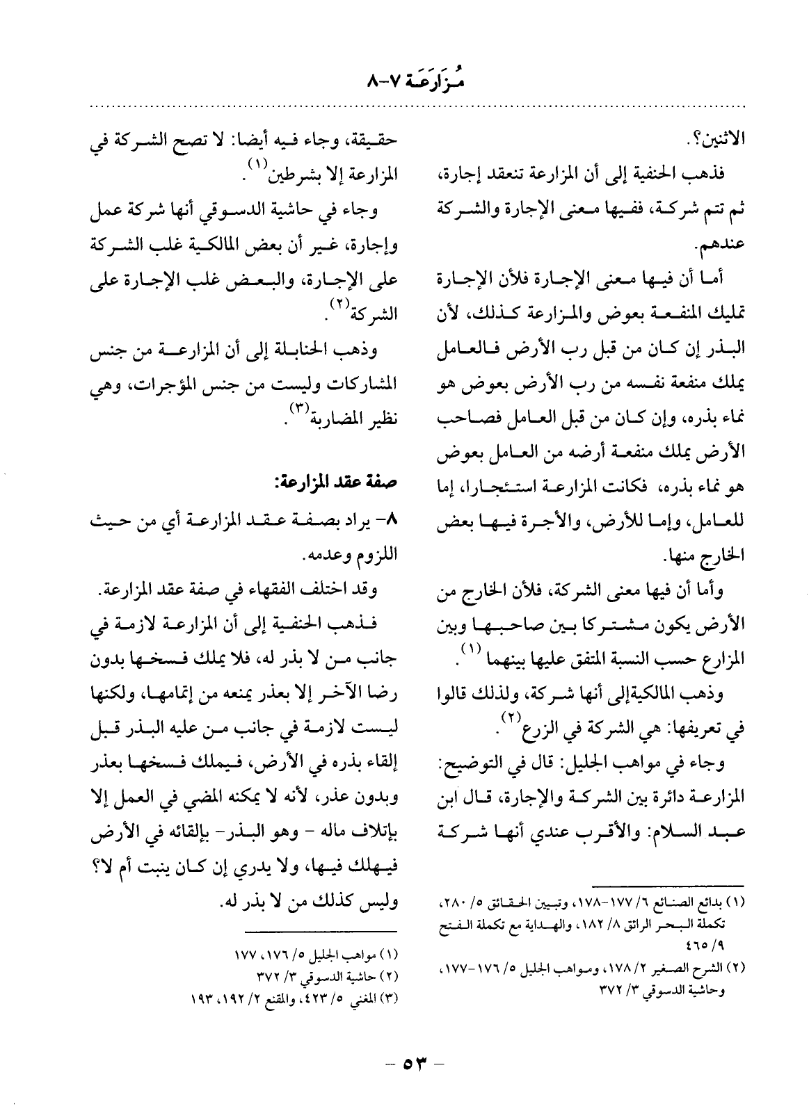 8 - يُرَادُ بِصِفَةِ عَقْدِ الْمُزَارَعَةِ أَيْ مِنْ حَيْثُ اللُّزُومُ وَعَدَمُهُ.