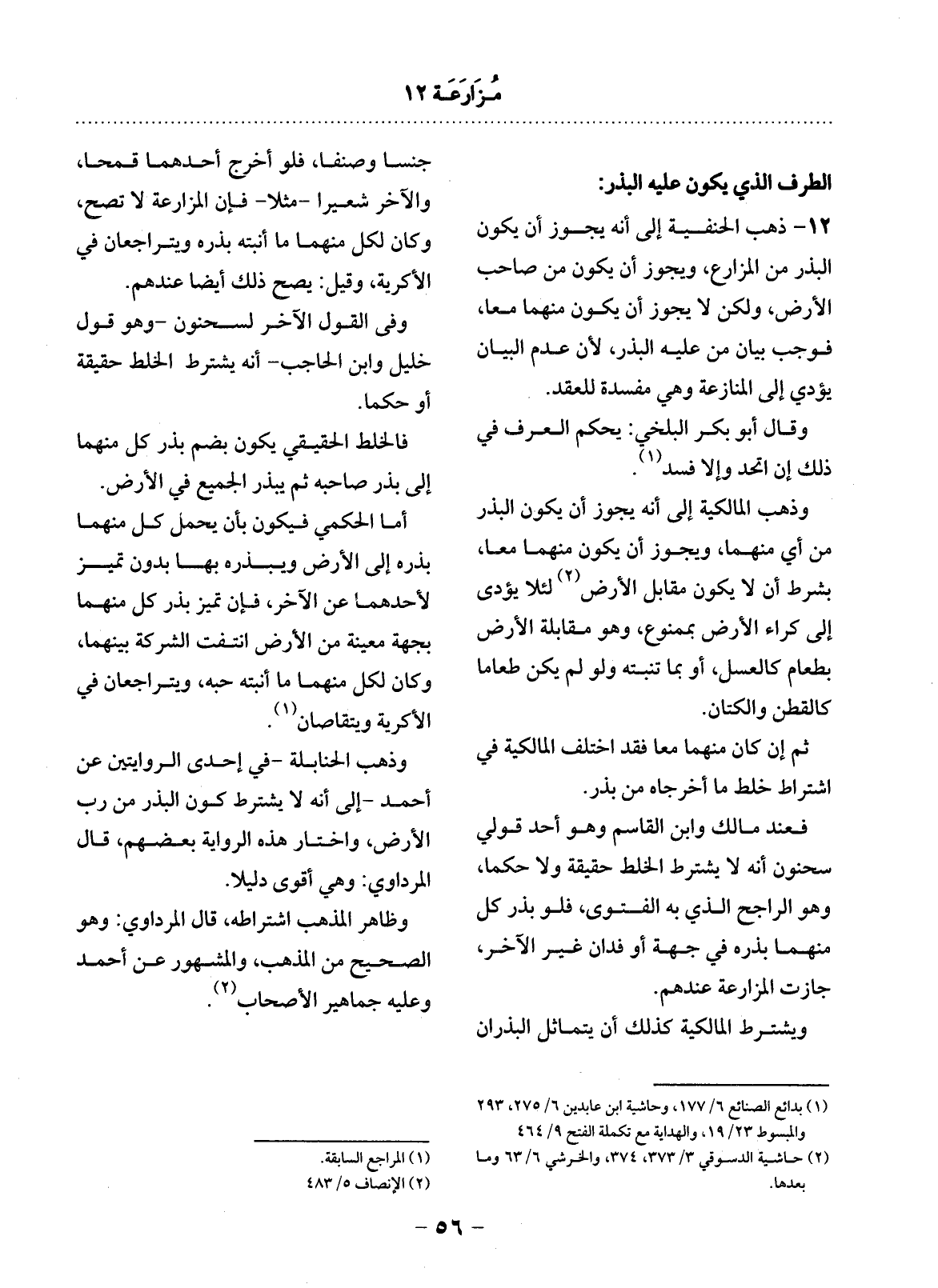 12 - ذَهَبَ الْحَنَفِيَّةُ إِلَى أَنَّهُ يَجُوزُ أَنْ يَكُونَ الْبَذْرُ مِنَ الْمُزَارِعِ، وَيَجُوزُ أَنْ يَكُونَ مِنْ صَاحِبِ الأَْرْضِ، وَلَكِنْ لاَ يَجُوزُ أَنْ يَكُونَ مِنْهُمَا مَعًا، فَوَجَبَ بَيَانُ مَنْ عَلَيْهِ الْبَذْرُ، لأَِنَّ عَدَمَ الْبَيَانِ يُؤَدِّي إِلَى الْمُنَازَعَةِ وَهِيَ مُفْسِدَةٌ لِلْعَقْدِ.