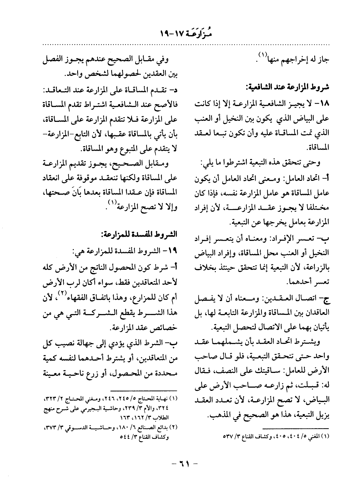 19 - الشُّرُوطُ الْمُفْسِدَةُ لِلْمُزَارَعَةِ هِيَ:
